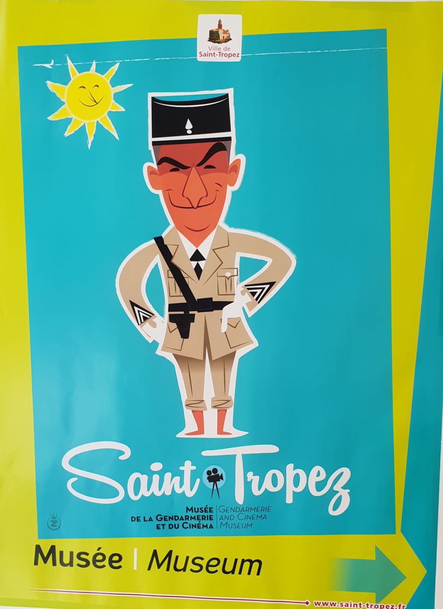 Was uns so überhaupt nicht in den Sinn kam, überrascht uns schon im Hafen: Ein Plakat mit der flotten 2CV-Nonne aus dem Saint Tropez Film mit Louis de Funès, mit Hinweis, dass es ein diesbezügliches Museum gäbe. Die Ulk-Filme mit Louis de Funès haben längst Kultstatus – wer hat sie nicht gesehen, die Filme mit dem Gendarmen von Saint Tropez, durchwegs glänzende Lachnummern und zugleich auch Zeitzeugnisse.