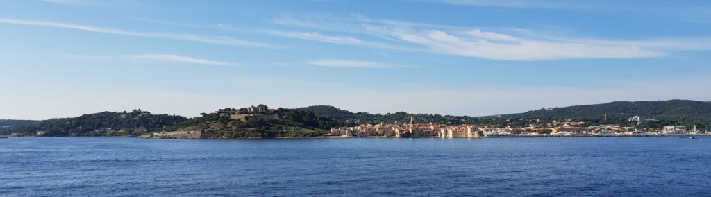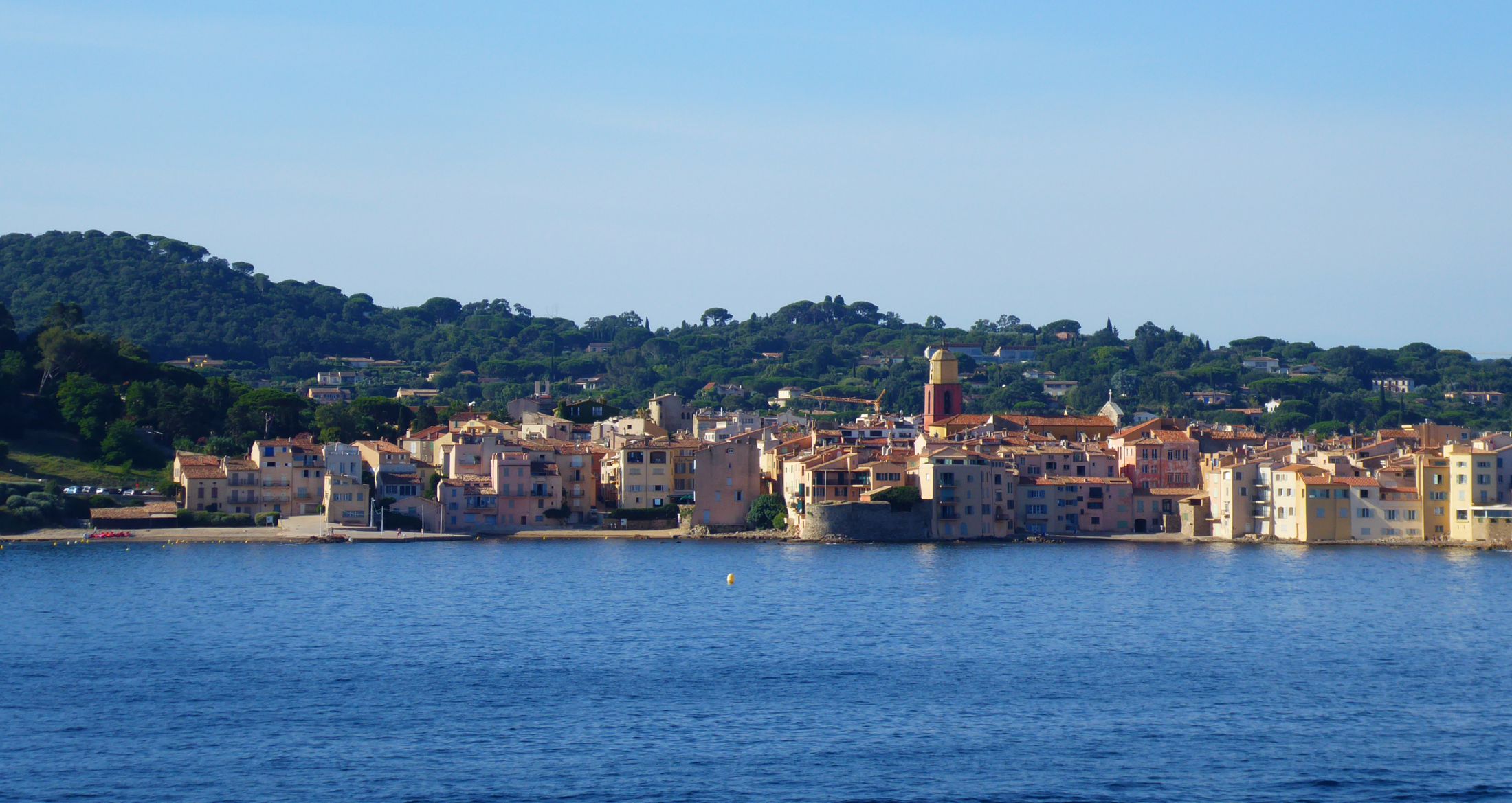 Südfrankreich. Anfahrt mit dem Schiff auf Saint Tropez. An der Küste kommt ein kleines Städtchen in Sicht, auf einem Hügel daneben eine Befestigungsanlage. Ein nettes Fleckchen Erde. Angelegt werden kann hier nicht, es muss geankert werden. Also geht es wieder mit dem Tenderboot an Land. Blauer Himmel, und wir haben schon bei der Fahrt zum Ufer eine herrliche Sicht, Richtung Saint Tropez, und im Blick zurück auf unser Schiff.