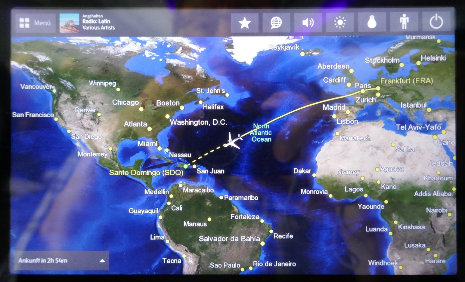 Wie immer, wenn man mit Condor unterwegs ist, ein „Hochgenuss“. Die Sitzreihen so eng gestellt, dass man keinen Platz hat, die Beine gerade zu stellen. Wenn man denn etwa 160 cm groß wäre würde man ja rückmelden, dass man bequem unterwegs wäre – aber ich bin nun mal etwa 30 cm größer. Das Ergebnis – sitzen wie die Ölsardine in der Büchse. Zur Entlastung hilft manchmal schräg sitzen, mit dem Erfolg, dass dauernd jemand ans Knie donnert, das etwas auf den Flur ragt; ist es mal nicht ein anderer Passagier, dann eine Stewardess mit einem Servierwagen.