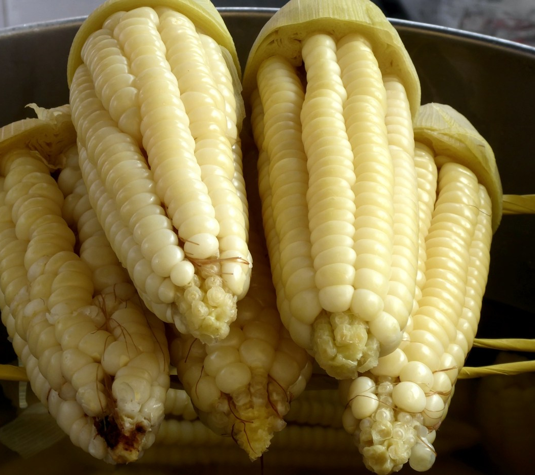 Erst auf den zweiten Blick fallen diejenigen Dinge auf, die typisch sind für Südamerika, zum Beispiel Mais in allen möglichen Farben und Größen. Die ganz großen sind ziemlich hell und bleich, ein Maiskorn hat in etwa die Größe einer Kirsche. Andere haben die bekannte gelbe Farbe, dann sind einige rötliche dabei, und sehr ungewöhnlich die tiefschwarzen Körner.