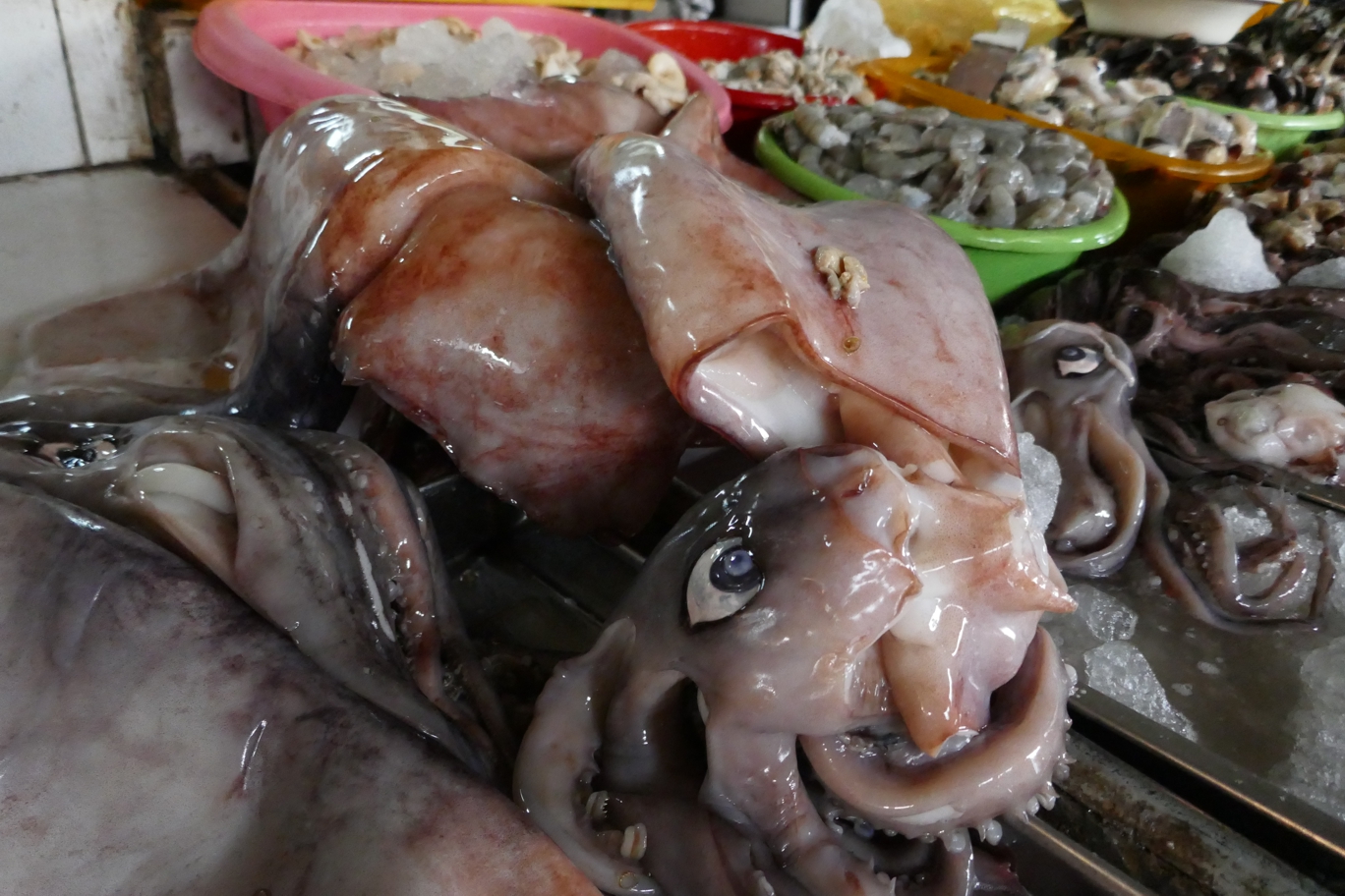 Ob Enten oder Gänse oder Wachteln, es geht so weiter. Auch beim Fisch – aber dafür sind wir wahrscheinlich schon etwas zu spät dran, der ist weitgehend verkauft. Zu sehen sind jetzt vor allem noch verschiedenste Muscheln und Shrimps in allen Größenordnungen.