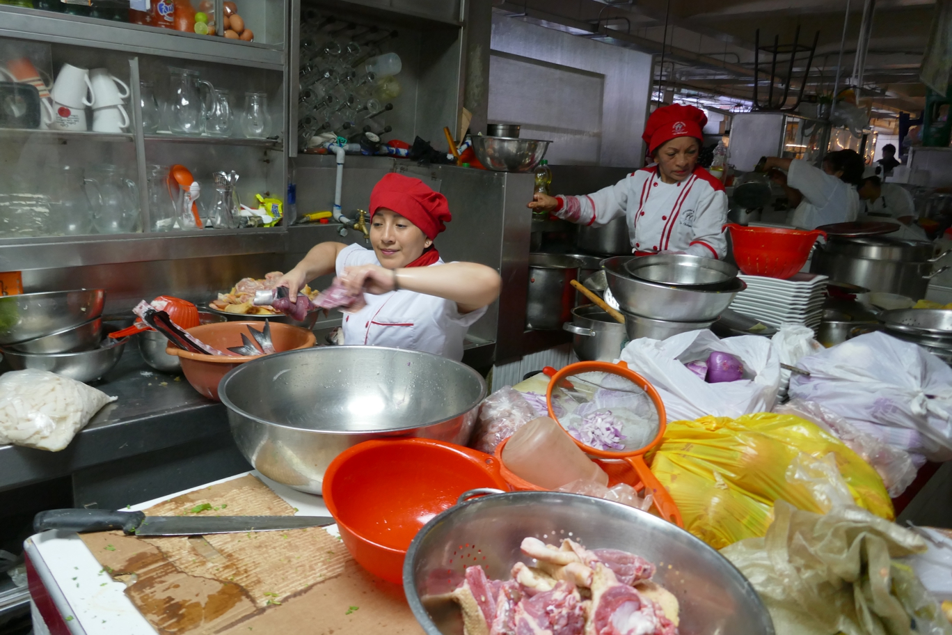 Im einem Zwischenbereich von all dem Angebot wird gekocht und gebraten. In atemberaubender Geschwindigkeit wird Gemüse geschnippelt, werden Fische filetiert oder Fleischstücke zugeschnitten. Das meiste verschwindet in großen Suppen-Kochtöpfen. Überall duftet es nach Frischeküche, an einigen Ständen wird gegessen.