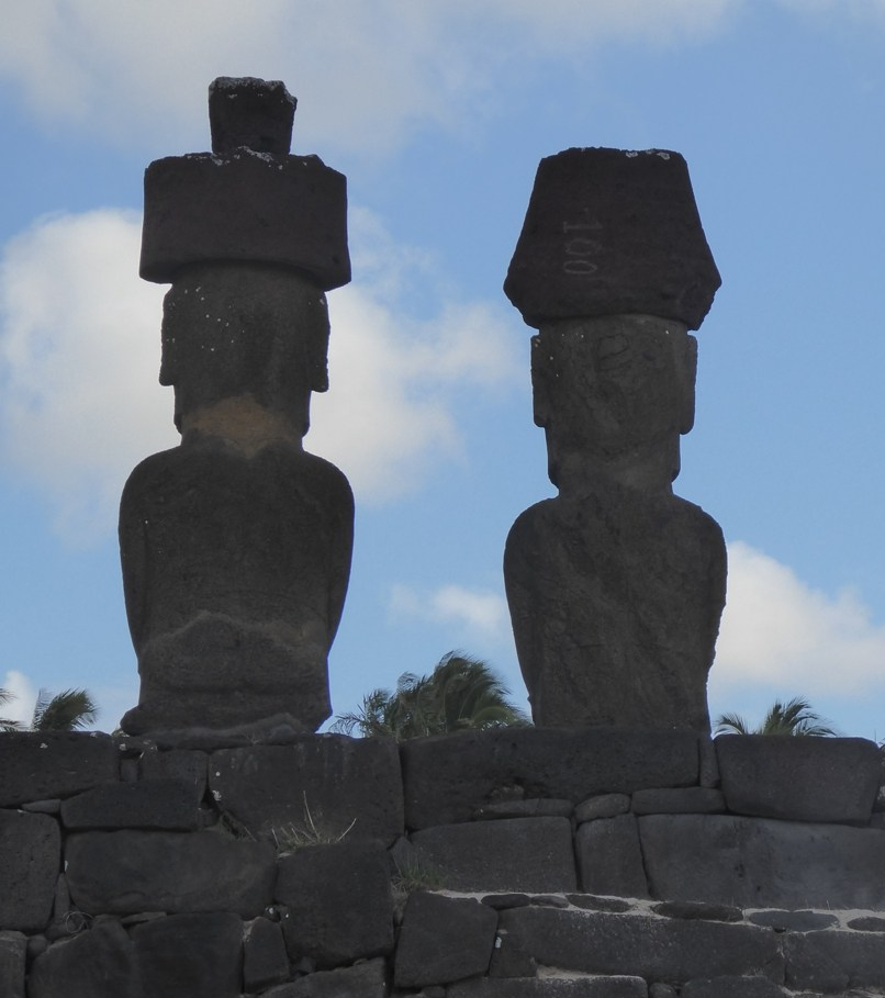 Die Körper und Köpfe sind aus grauem Vulkangestein, die Hüte der Figuren aus rotem Vulkangestein – rot als die Farbe der wichtigen Häuptlinge. An verschiedenen Stellen sieht man, dass diese Figuren wie in einem Puzzle-Spiel wieder zusammengesetzt wurden – was für alle Maoi gilt. Sie wurden nämlich von der einheimischen Bevölkerung vor etwa 300 Jahren allesamt zerstört, im Zusammenhang mit einem völligen Verfalls der tradierten Kultur und damit auch mit dem Verlust alles Wissens über diese.