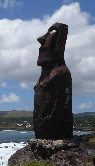 Die Moai, die verstreut über der Insel verteilt sind, haben alle zwar Augenhöhlen, aber keine Augen; lange war man davon ausgegangen, dass dies generell so wäre. Neuere archäologische Forschungen ergaben jedoch, dass zu besonderen kultischen Handlungen Augen eingesetzt wurden, das weiße der Augen aus Muschelkalk, die Pupille aus Obsidian. Zum einzigen solchen Moai, dessen Augen rekonstruiert wurden und der diese jetzt dauerhaft trägt, geht unsere Fahrt weiter. Auch er steht am Ufer, aber auf der anderen Seite der Insel, bei der unser Schiff liegt, bei Hangaroa, der Inselstadt. Unterwegs sehen wir mehrere Moai’s, die Augen haben; aber diese sind jüngeren Datums.