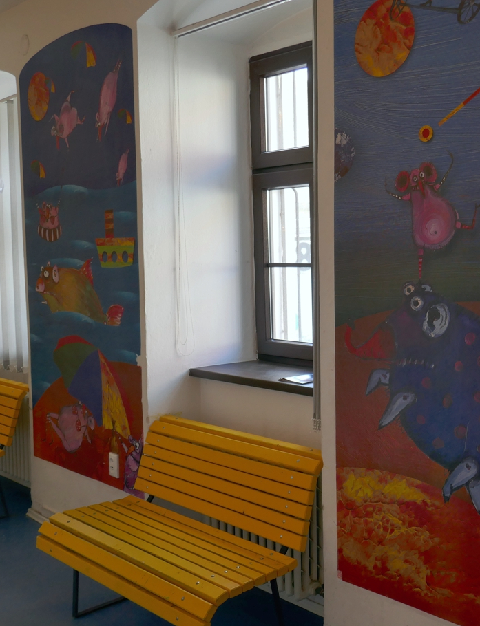 Schon im Eingangsbereich sehen wir fröhliche bunte Bilderbuchbilder an den Wänden. Natürlich darf auch der „kleine Maulwurf“ nicht fehlen – der als tschecheslowakisches Produkt auch den Weg in die zwei Staaten Tschechien und Slowakei gefunden hat. Interessant ist, dass sich ein paar Häuser weiter ein kleiner Laden an das Kinder-Thema angepasst hat.