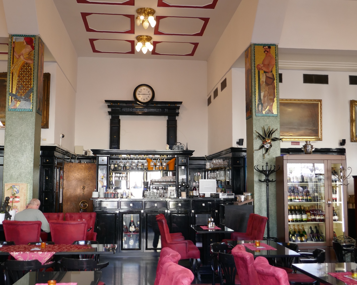 Pause in einem typischen Café – der Kaffee kann weniger begeistern, aber wir sitzen gut, mitten im historischen Ambiente. Die Einrichtung ziemlich plüschig, aus längst vergangenen Zeiten – aber bequem, und die Räumlichkeiten insgesamt stimmig, bis hinauf zur Decke. An den Säulen glitzern Mosaike, die noch aus der Zeit des Jugendstils zu stammen scheinen. Mittendrin im Raum ein Flügel – und Lydia hat die Gelegenheit, im Café mit ein paar eigenen Melodien aufzuspielen.