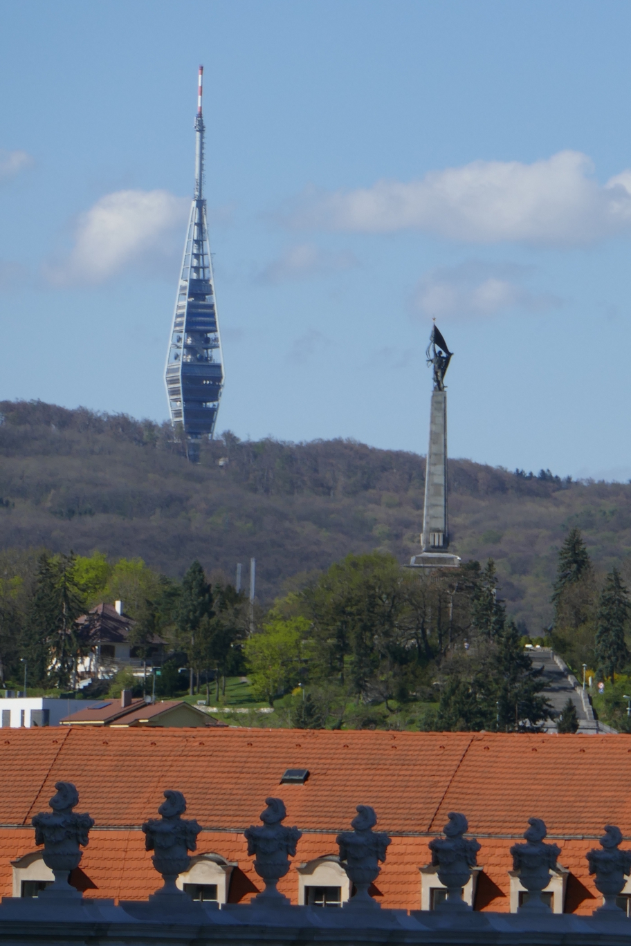 Der Blick in die andere Richtung, den Hügeln zu, zeigt in nachdenklich-merkwürdiger Kombination vorne das Kriegsdenkmal, das an tausende sowjetischer Soldaten erinnert, die hier im Zweiten Weltkrieg getötet wurden, und weiter entfernt auf dem Hügel den 200 Meter hohen Fernsehturm.