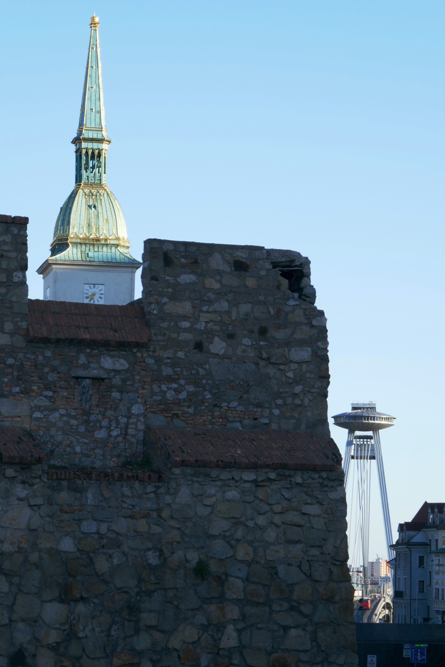 Der Blick hinunter vom Berg eröffnet immer wieder interessante Perspektiven. Mal ist es die pittoreske Altstadt mit ihren Kirchtürmen, alten Gebäuden, engen Gassen, dann wieder eine Kombination von Burgmauern und Ufo-Turm, und, je weiter man noch oben kommt, immer dominierender auch die neue Stadt auf der anderen Seite der Donau, eine Plattenbau-Siedlung mit fast endlos wirkenden, teilweise ineinander verschlungenen Hochhauszeilen.