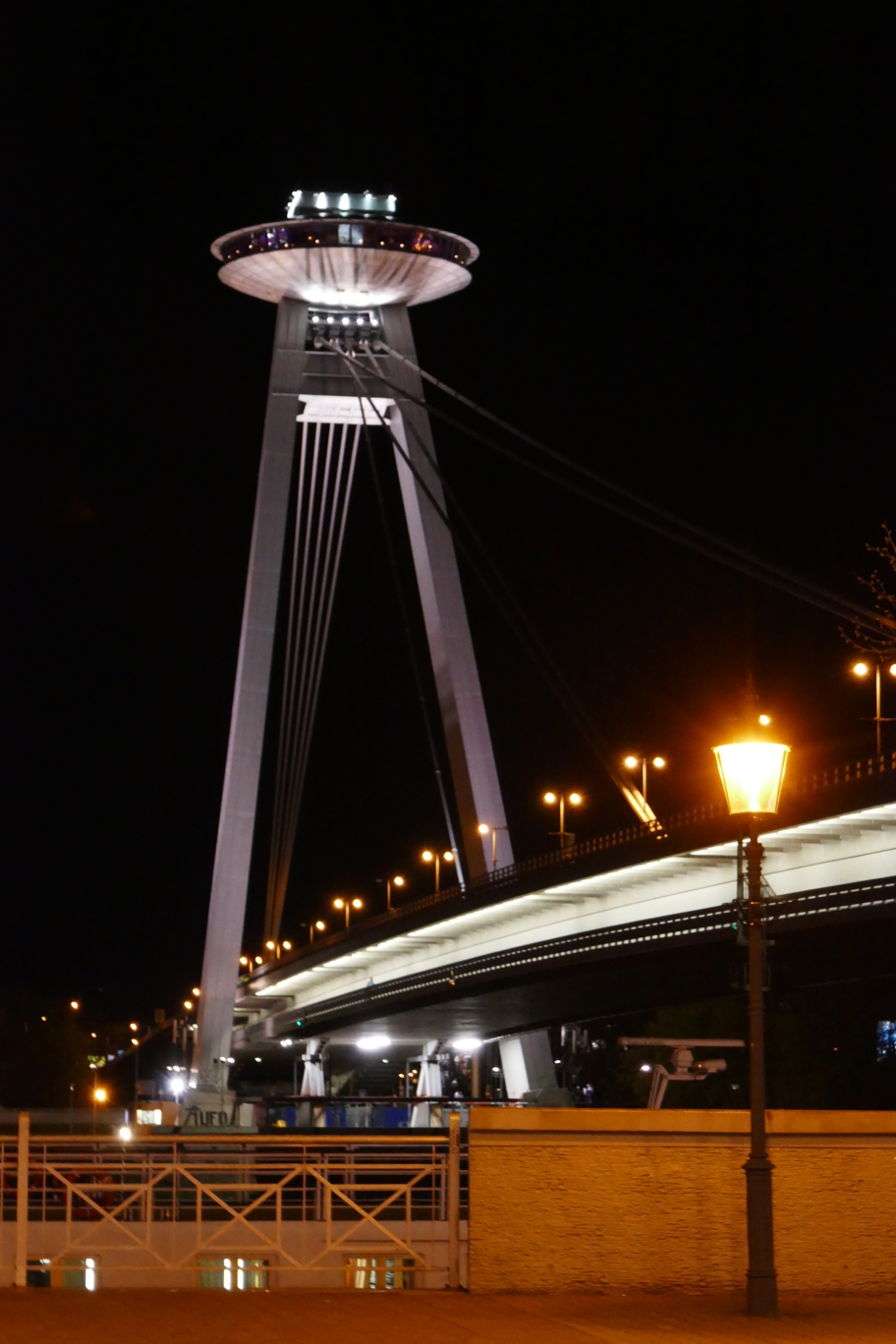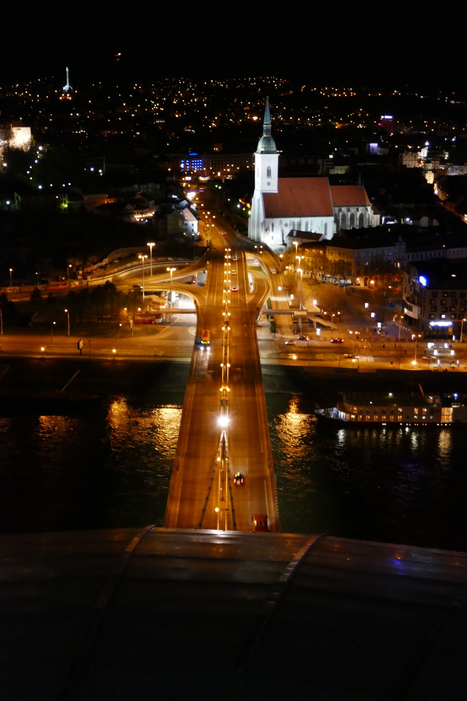 Danach steuern wir die Donau-Brücke an, wollen nach Möglichkeit von hoch oben einen schönen nächtlichen Überblick über die Stadt haben. So richtig Eindruck macht die Brücke noch einmal, als es mit dem Taxi drüber geht – sie hat eine Spannweite von über 300 Metern, erfahren wir. Über der Straße thront das „Ufo“.