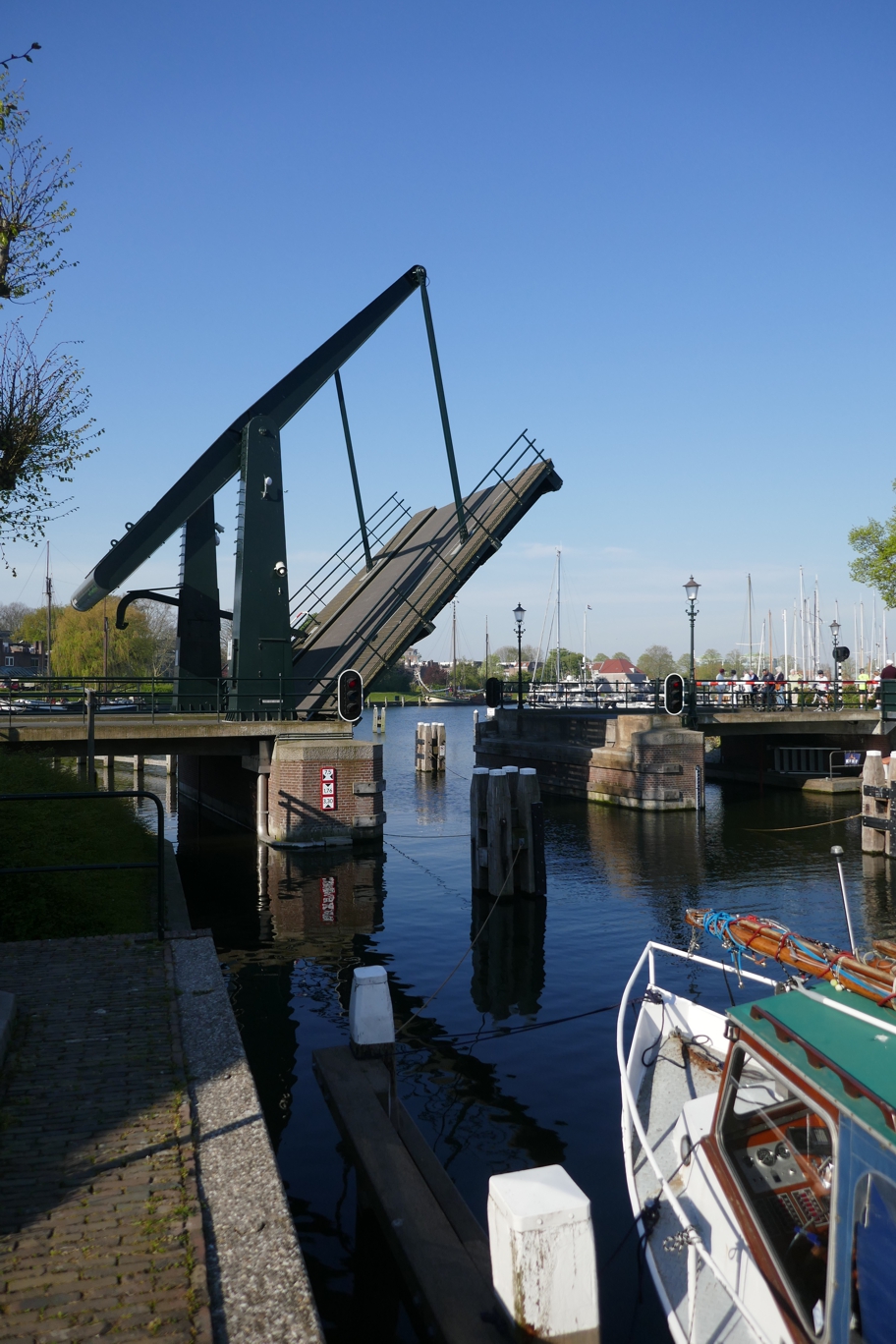 Im Binnenhafen sehen wir ein ziemliches Gewirr von Schiffen und Masten – neben modernen Booten stehen hier auch ziemlich viele historische Zwei- und Dreimaster. Immer mal wieder öffnet sich die Zugbrücke, die den Weg nach draußen, zur Fahrtrinne zum IJsselmeer öffnet.
