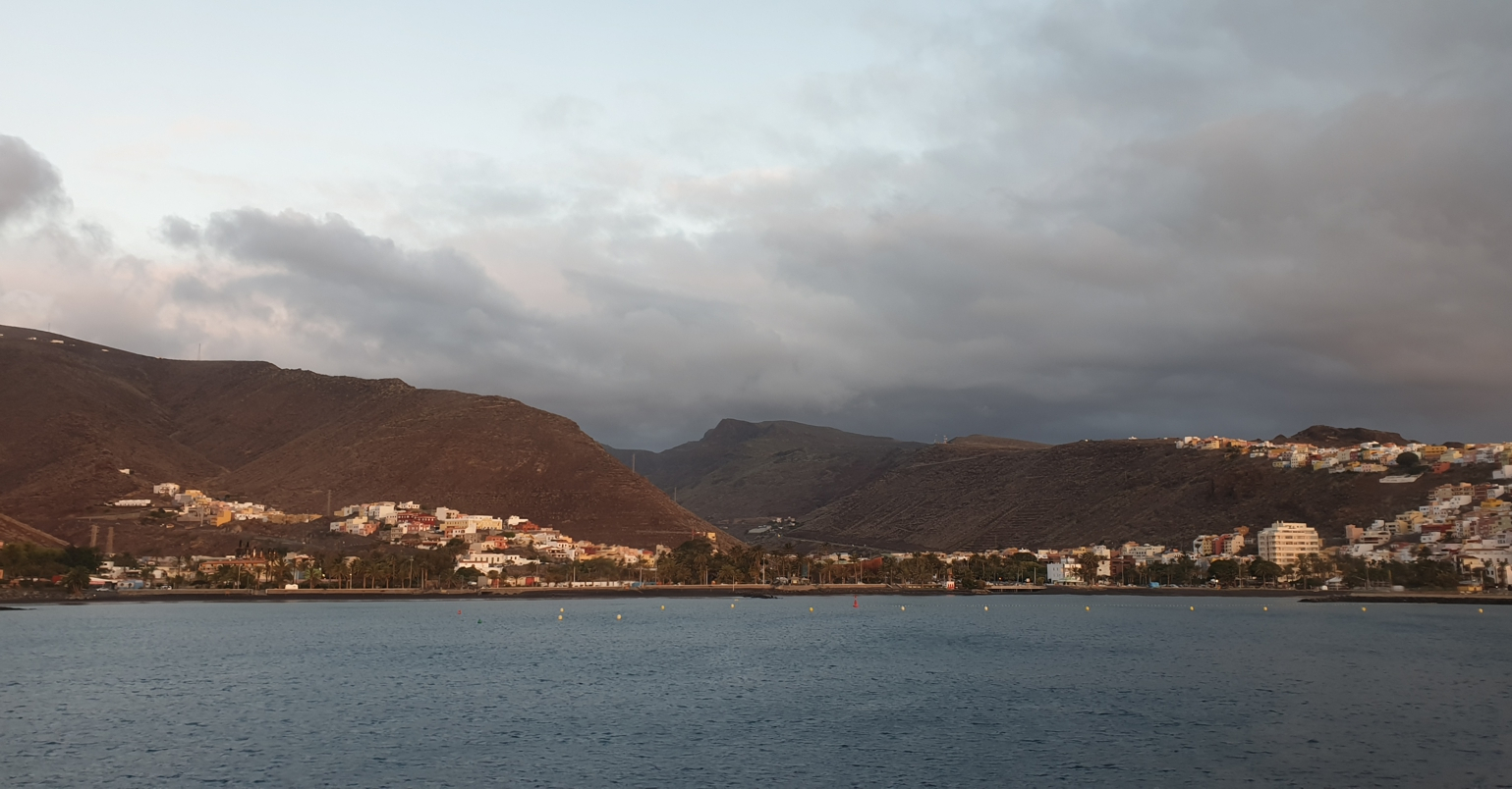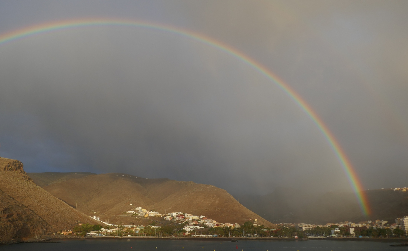 Früh am Morgen kommen wir mit dem Schiff in San Sebastian an. Die Sonne geht auf, der Himmel zeigt sich über La Gomera blau mit einem Mix von Wolken in allen weiß-grau-Schattierungen. Es regnet leicht – und die Insel empfängt uns mit einem intensiv farbigen, bombastischen und gleich doppelten Regenbogen, der untere Bogen intensiv, der obere nur leicht schimmernd, so groß und nah, dass er mit dem Foto nicht mal ganz einzufangen ist.