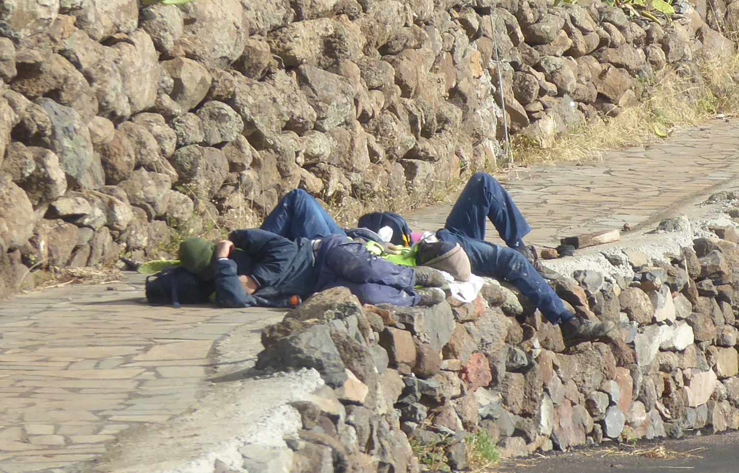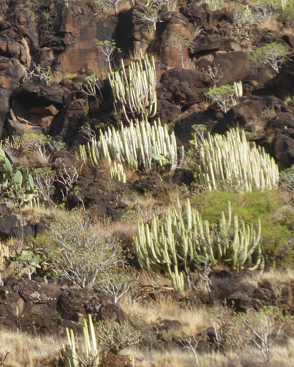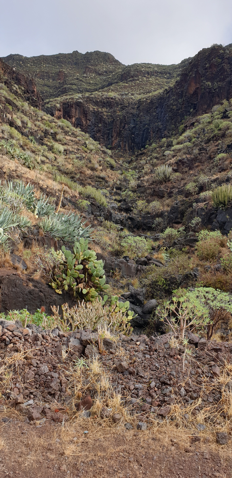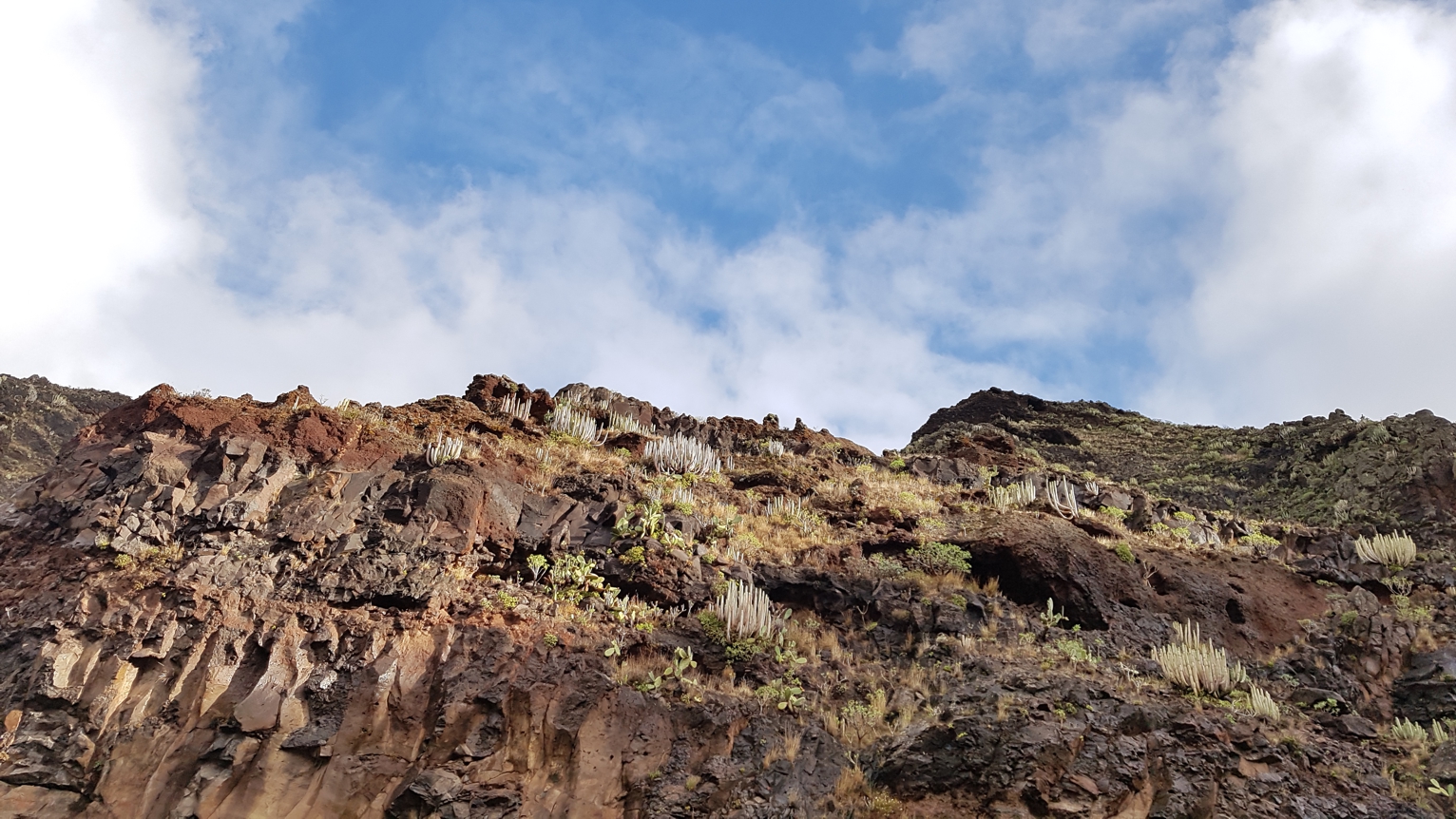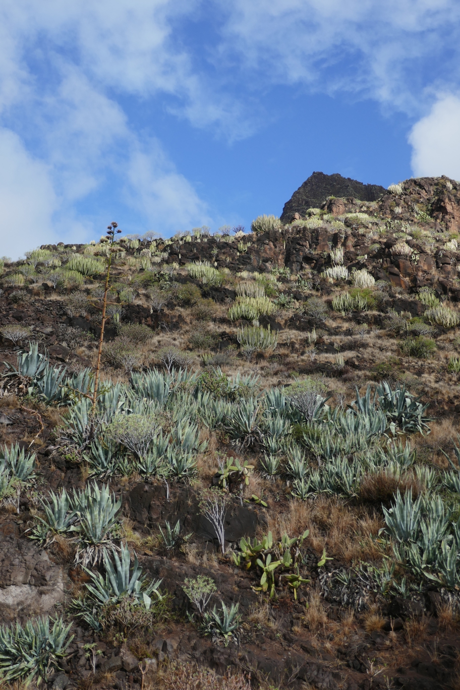 Von San Sebastian aus geht es gleich hinein in die Berglandschaft. Enge Kurven und unglaubliche Steigungen erwarten uns; das kleine Auto schnaubt und röhrt. Die Landschaft ist atemberaubend. Man weiss nicht so recht, wie man sie beschreiben soll – eine an sich karge, steinige Gegend, aber doch dicht bewachsen von kleinem Gestrüpp, Blumen und vor allem vielen Sukkulenten und Wolfsmilchgewächsen. Das Wetter zeigt sich launisch, mal dichte Wolken, mal kommt der blaue Himmel raus – auffallend, wie schnell sich die Szenerie ändert. Wo eben noch Sonnenschein war, ist ein paar Minuten später kaum mehr etwas zu sehen. Die Wolken fallen wie luftige kleine Lawinen regelrecht die Berghänge hinunter.