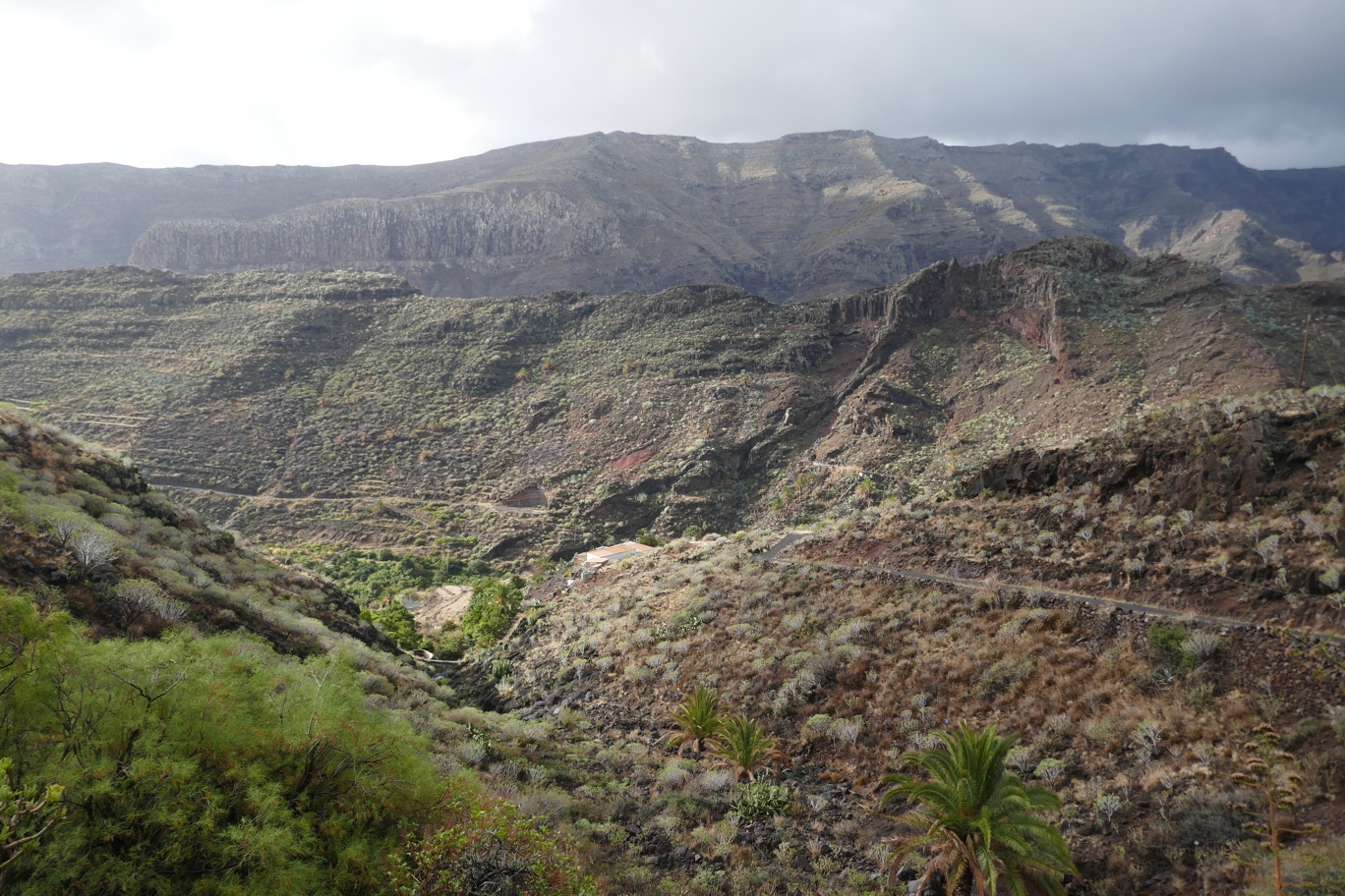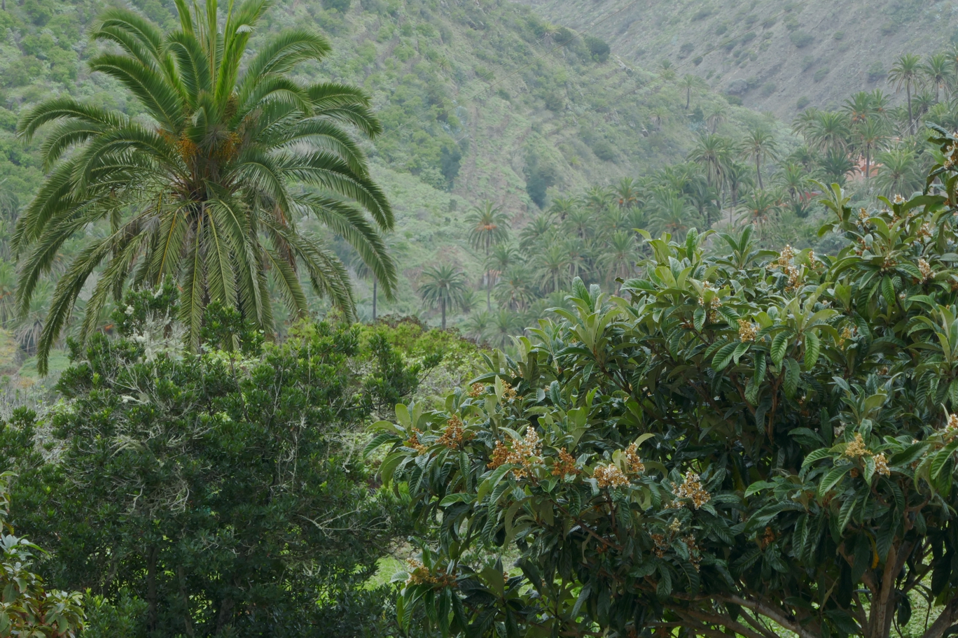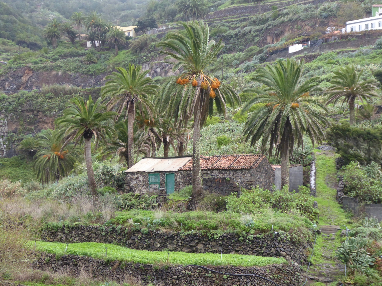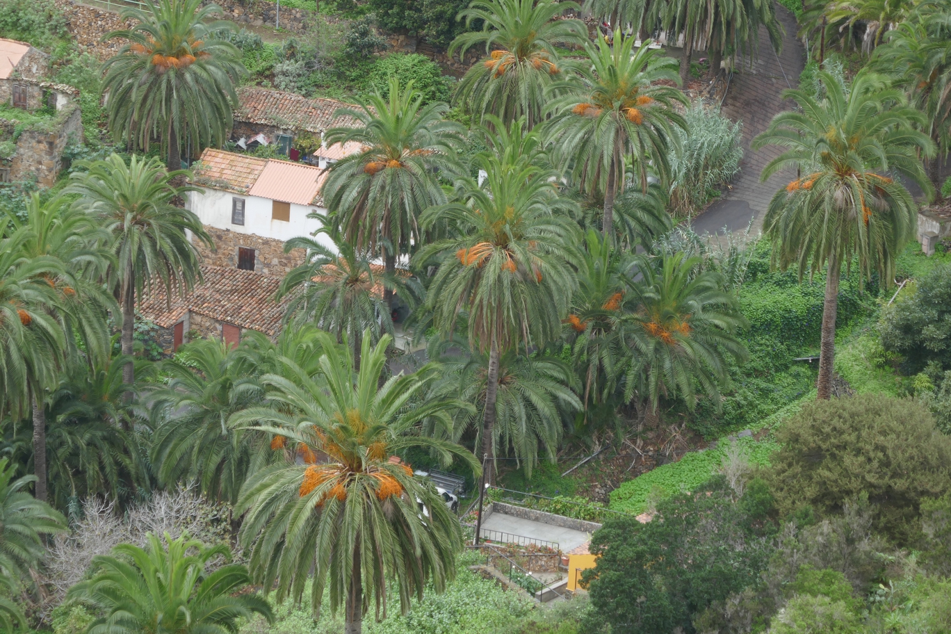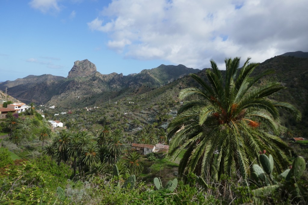 Dazwischen sieht man immer wieder hohe Palmen, die mit ihrer Größe und noch mehr mit den goldgelben Dattelständen Akzente in der Landschaft setzen. San Sebastian liegt im Westen; wir fahren über die Berge zunächst in den Norden, nach Agulo.