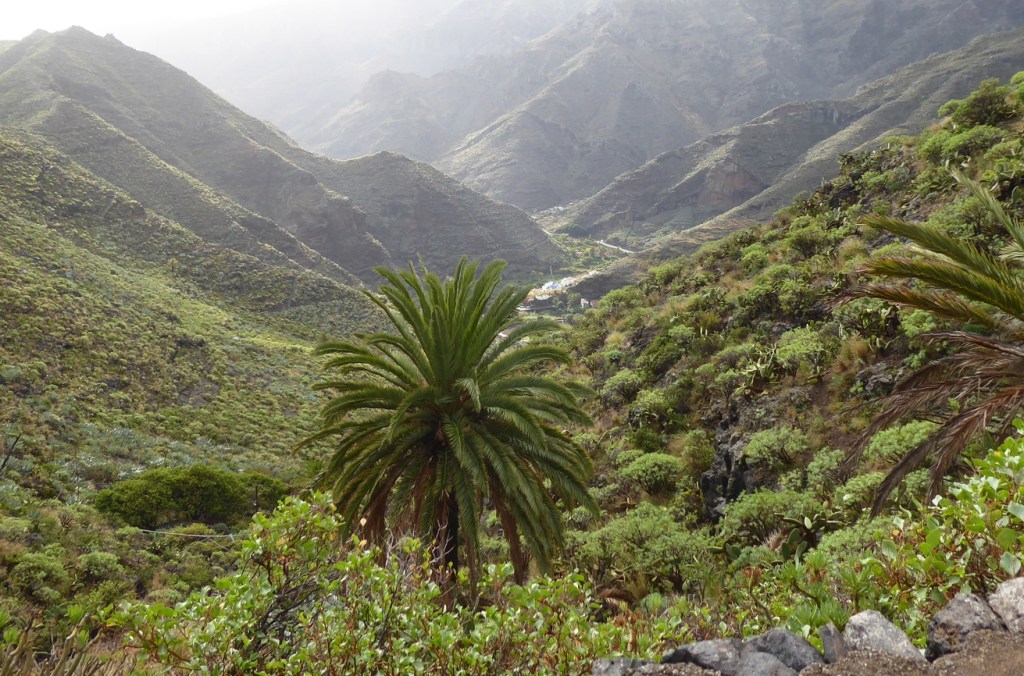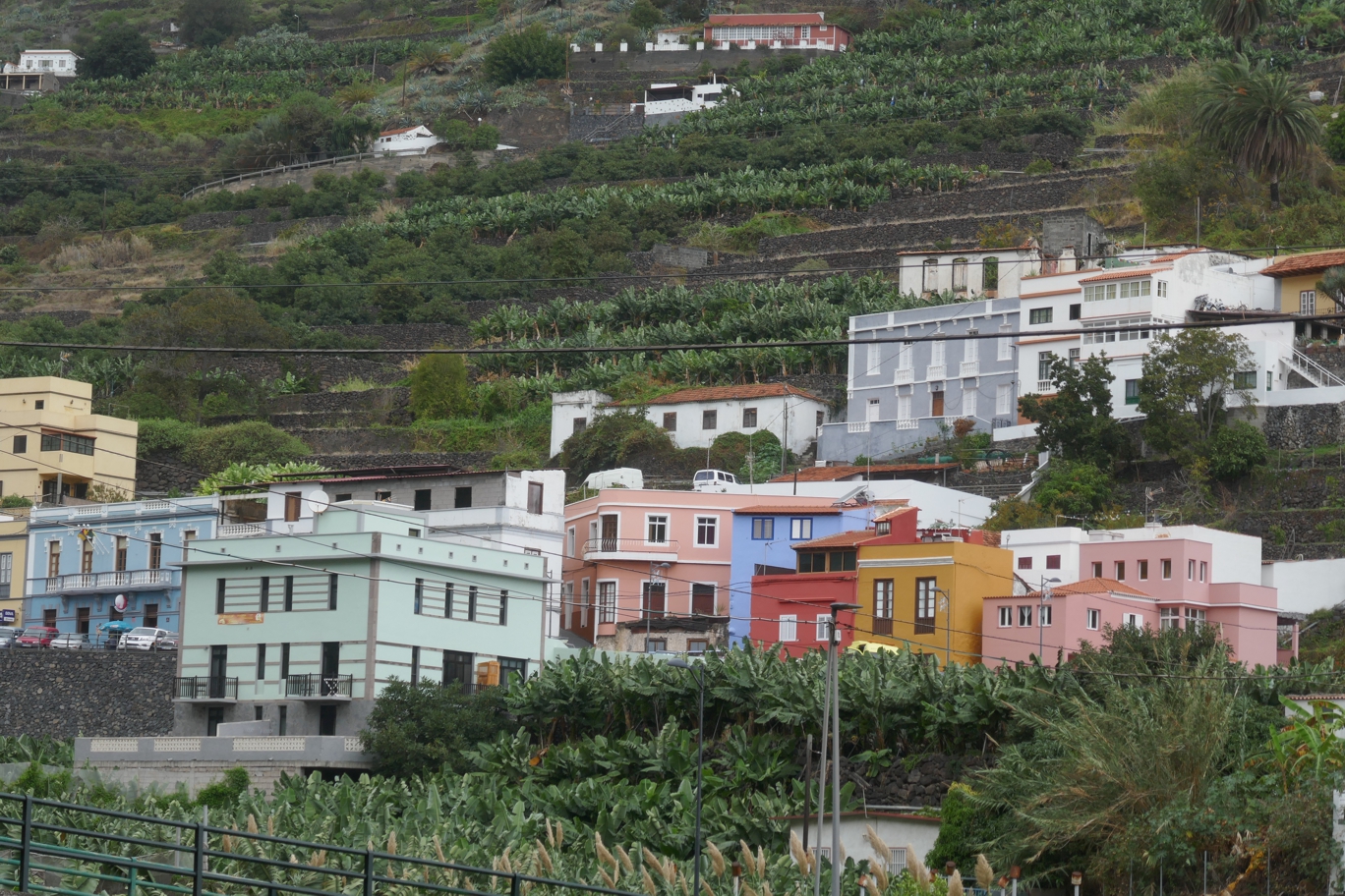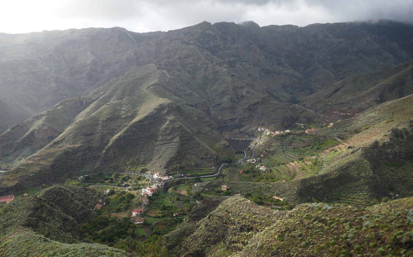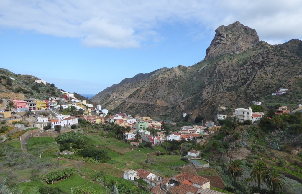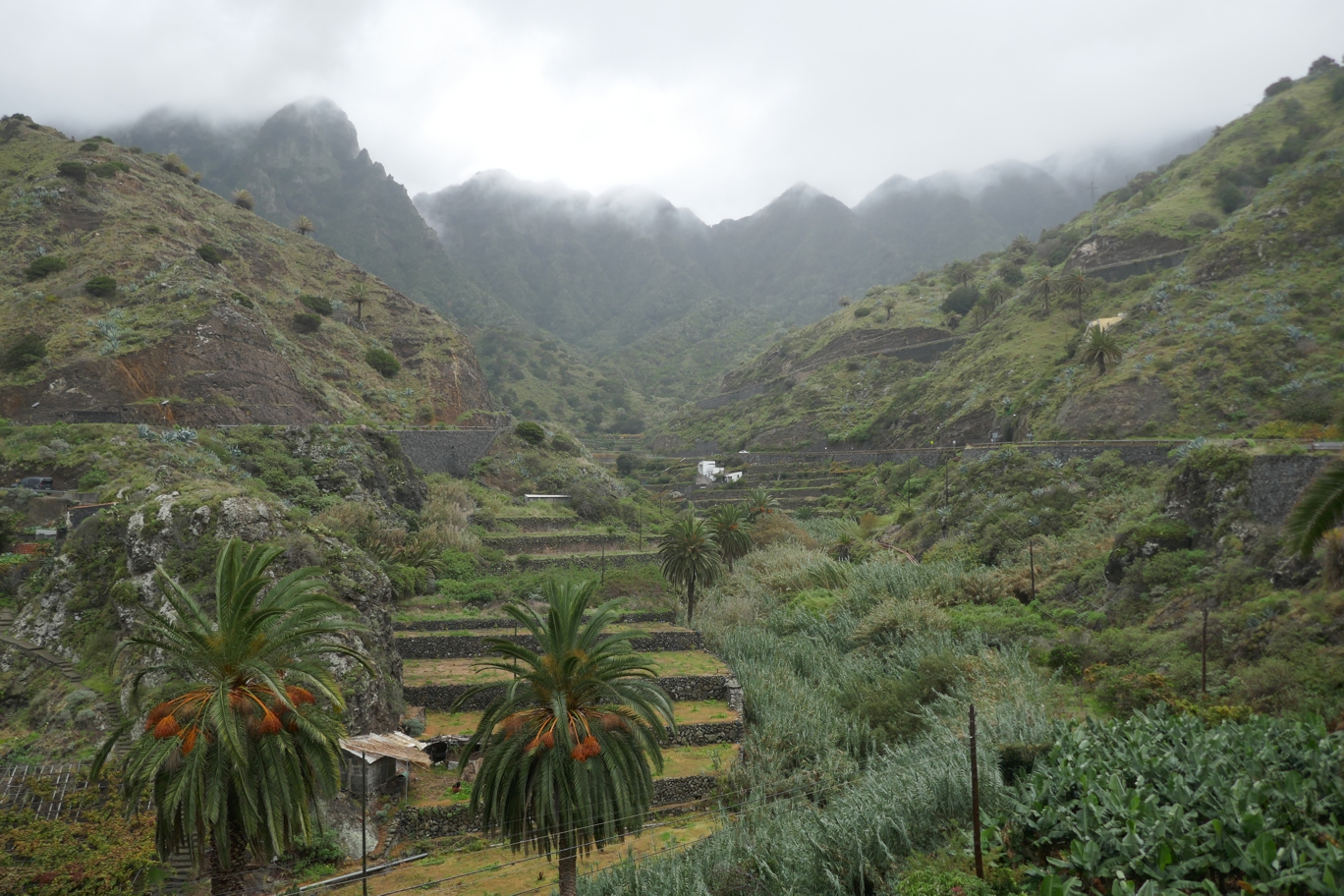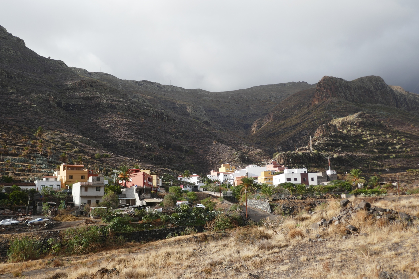 Dazwischen sieht man immer wieder hohe Palmen, die mit ihrer Größe und noch mehr mit den goldgelben Dattelständen Akzente in der Landschaft setzen. San Sebastian liegt im Westen; wir fahren über die Berge zunächst in den Norden, nach Agulo.