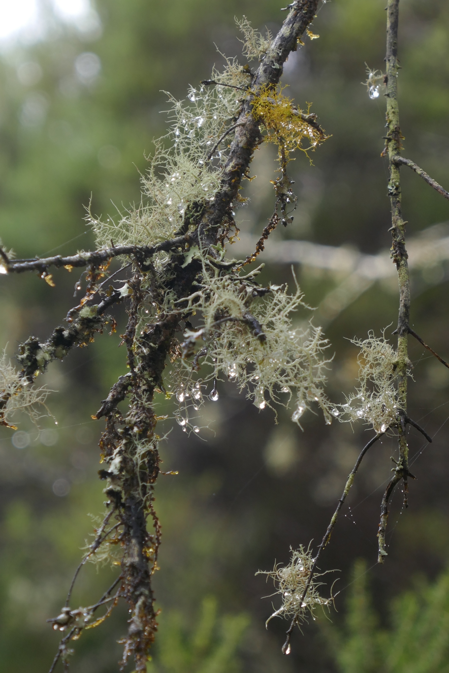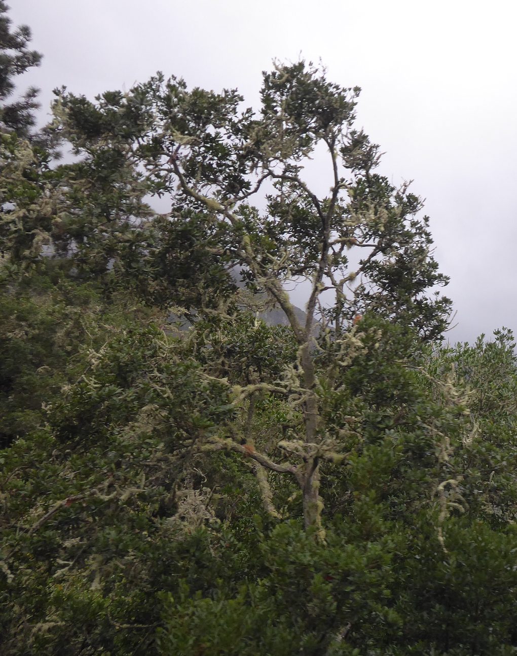 Oben in den Bergen ziehen Nebelschwaden die Hänge hoch, die Gipfel verstecken sich in den Wolken. Je höher wir kommen und je mehr einer der Berghänge in Richtung Norden liegt, desto mehr zeigen sich die Baumstämme nass und feucht, schwarz glänzend, bewachsen mit Moosen und Flechten, von den Ästen herabhängend manchmal fast gespenstisch aussehende Bartflechten. Immer wieder gibt es weite Ausblicke.