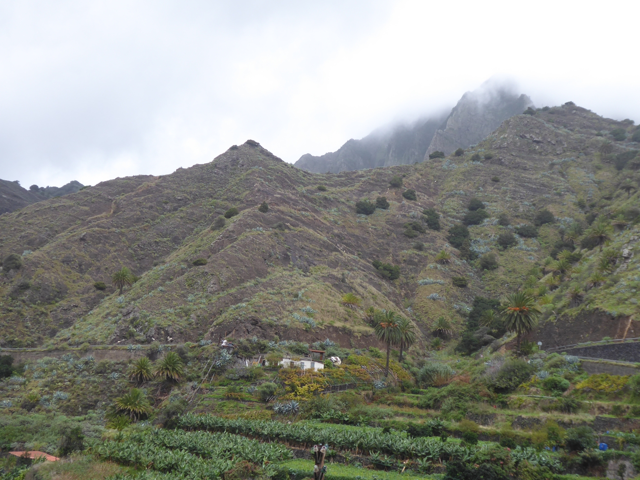 In den Tälern und an vielen Berghängen sind Terrassenfelder angelegt, die vor allem in den küstennahen, etwas weniger steilen Gebieten oft noch intakt und bewirtschaftet sind. So wie es aussieht wird vor allem Gemüse angebaut; ganz unten, wo das Tal flacher ist, sind Bananenplantagen zu sehen, die oft wie riesige Zelte überdacht sind.