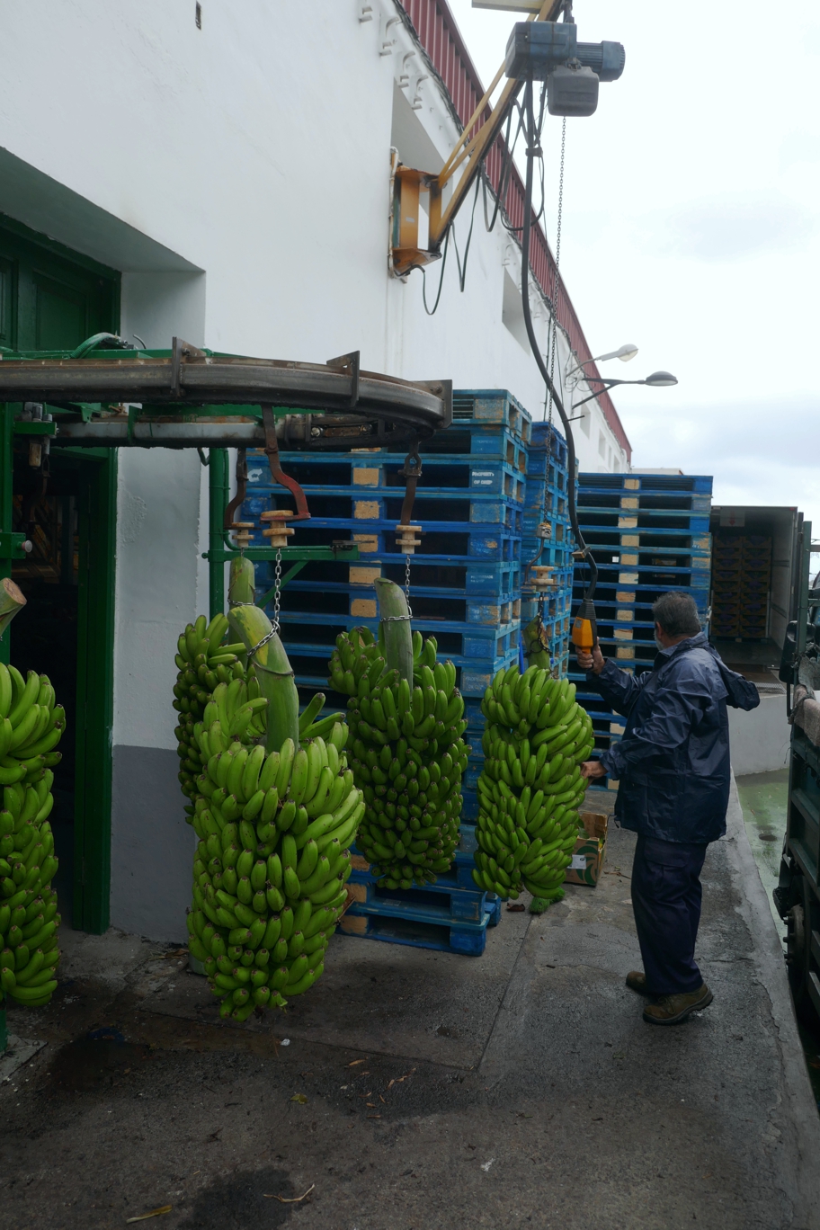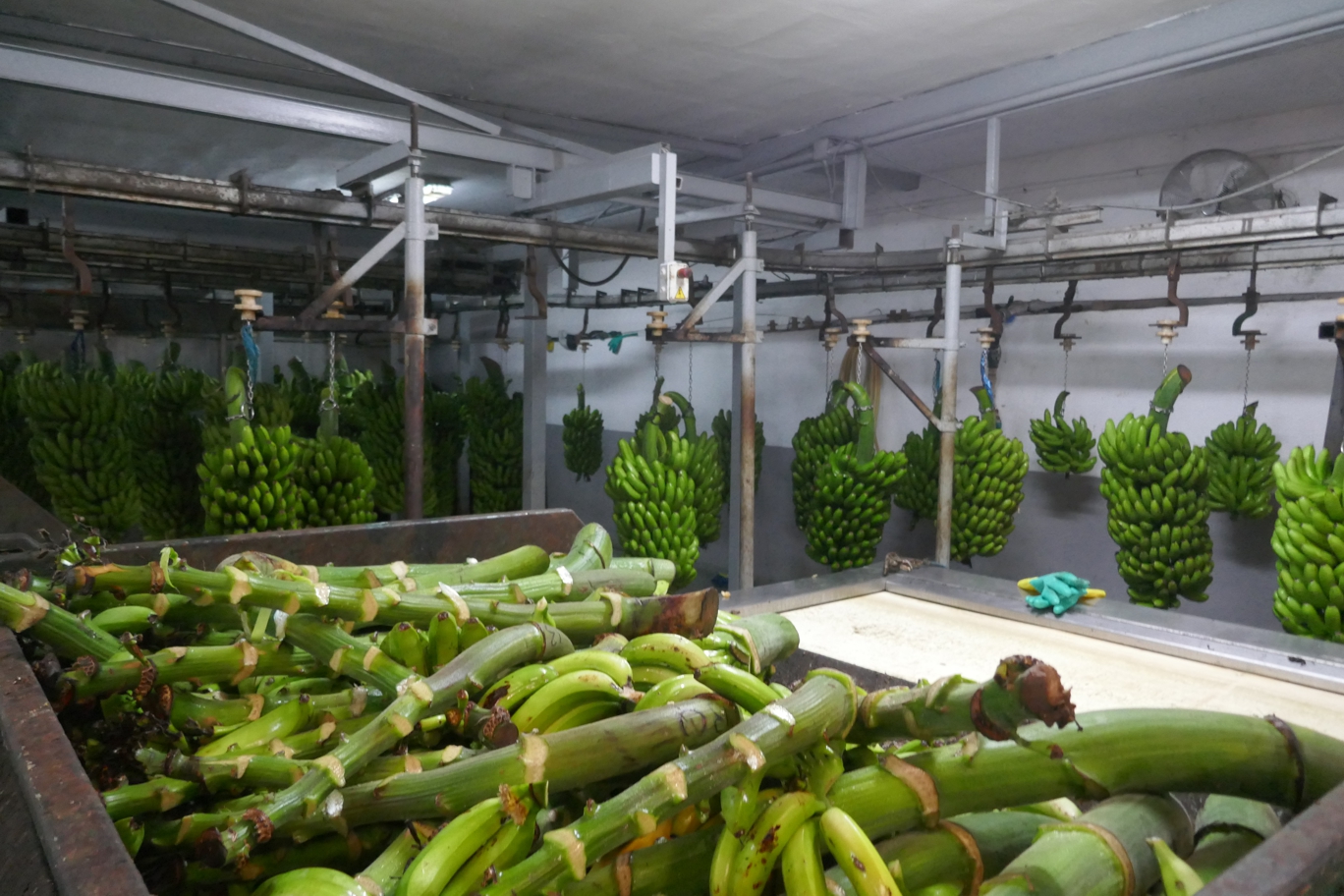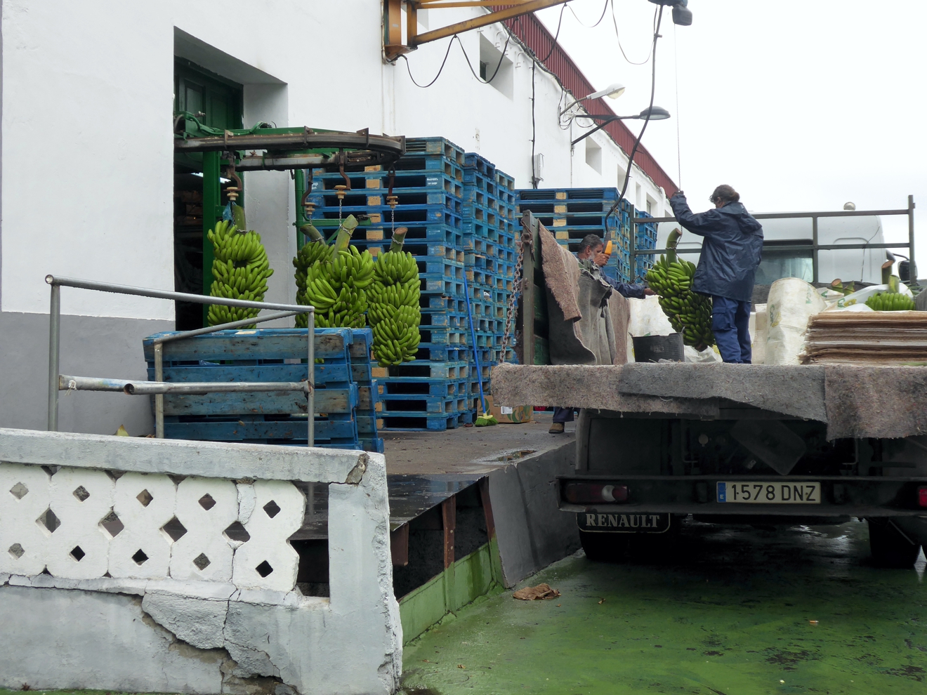 In einem der kleinen Orte entdecken wir eine Cooperative, in der Bananen für den Vertrieb angeliefert und gepackt werden. Gerade laden zwei Männer die ziemlich großen Bananenstauden mit den noch grasgrünen Bananen von einem Lastwagen ab, hängen diese auf ein Förderband. Ein freundliches Winken, ich soll doch in die Verarbeitungshalle hinein kommen. Dort gehen die Bananenstauden durch ein Reinigungsbad – da sie hoch glänzend wieder herauskommen und diesen Glanz auch behalten, wird wohl auch Konservierungsmittel drin sein. Zwei Mann zerlegen die Stauden in Einheiten, wie sie dann auch bei uns zu kaufen sind; sechs Mann packen alles in die bekannten Bananenkisten; alles kommt auf Paletten in eine Lagerecke. Bei den „Zerlegern“ stehen große Container mit all dem, was auf dem Kompost landen wird – zu kleine Bananen, Bananen mit Flecken, aufgeplatzte Bananen oder auch die dicken Staudenstiele.