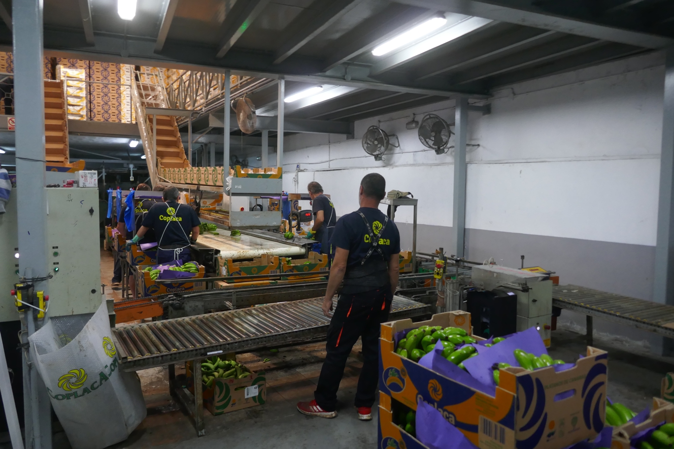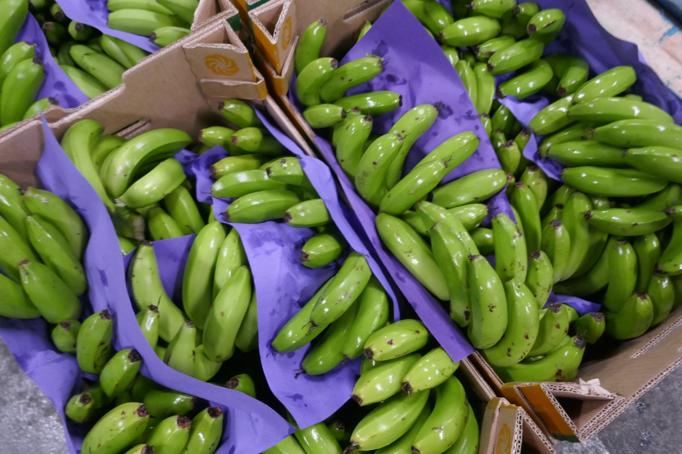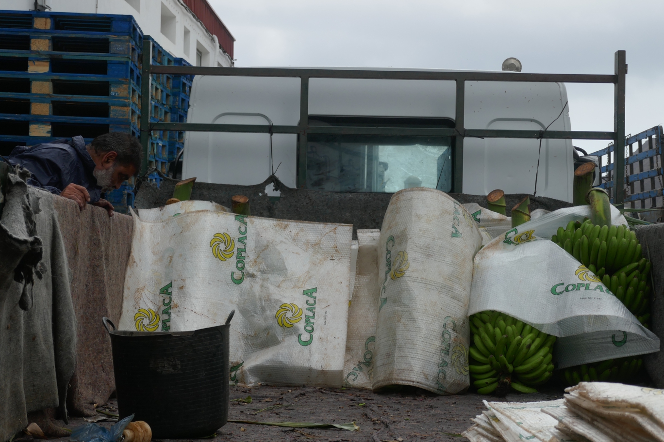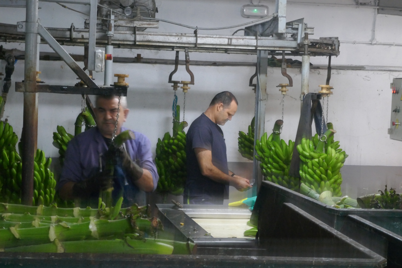 In einem der kleinen Orte entdecken wir eine Cooperative, in der Bananen für den Vertrieb angeliefert und gepackt werden. Gerade laden zwei Männer die ziemlich großen Bananenstauden mit den noch grasgrünen Bananen von einem Lastwagen ab, hängen diese auf ein Förderband. Ein freundliches Winken, ich soll doch in die Verarbeitungshalle hinein kommen. Dort gehen die Bananenstauden durch ein Reinigungsbad – da sie hoch glänzend wieder herauskommen und diesen Glanz auch behalten, wird wohl auch Konservierungsmittel drin sein. Zwei Mann zerlegen die Stauden in Einheiten, wie sie dann auch bei uns zu kaufen sind; sechs Mann packen alles in die bekannten Bananenkisten; alles kommt auf Paletten in eine Lagerecke. Bei den „Zerlegern“ stehen große Container mit all dem, was auf dem Kompost landen wird – zu kleine Bananen, Bananen mit Flecken, aufgeplatzte Bananen oder auch die dicken Staudenstiele.