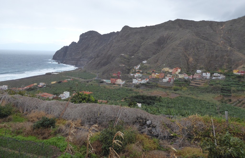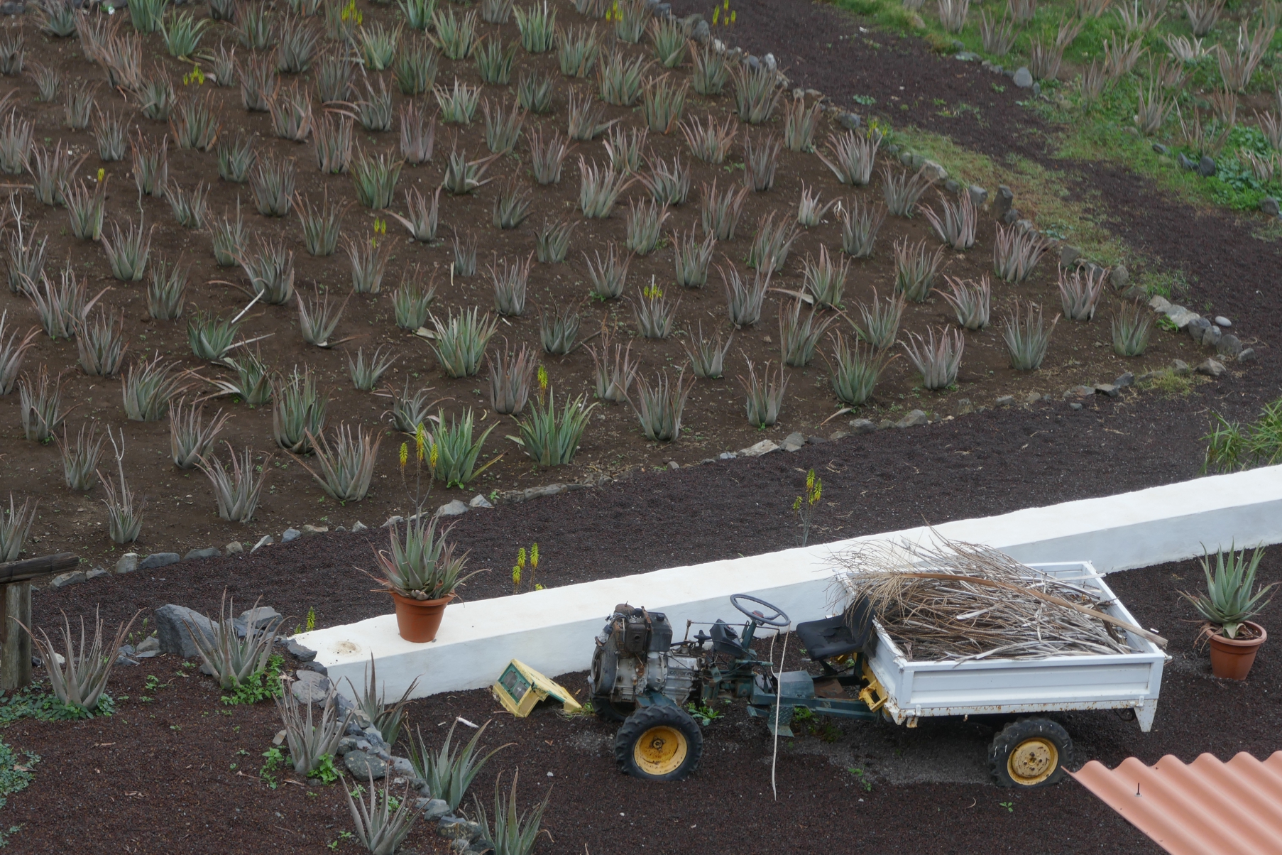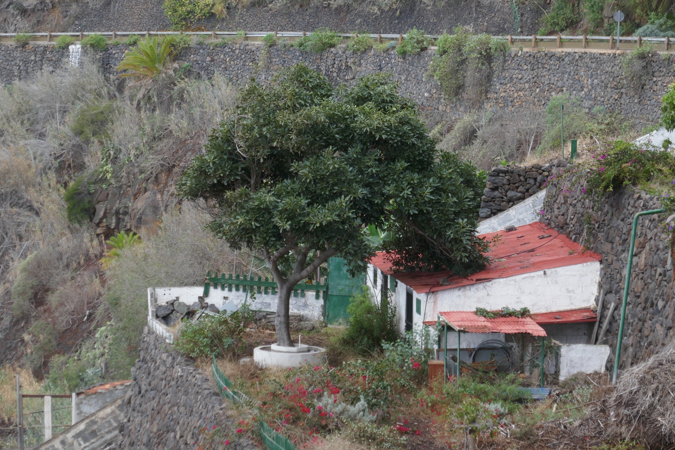 Unten in der etwas flacheren Talebene stehen traditioneller bewirtschaftete Bananenplantagen, die nicht wie diejenigen, die wir auf der anderen Inselseite gesehen haben, komplett zum Schutz gegen Insekten oder Witterungseinflüsse mit Zeltdächern ummantelt sind.
