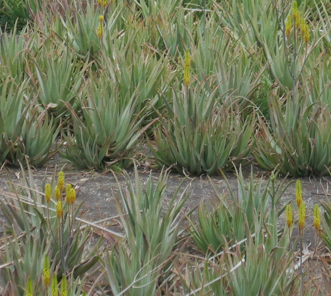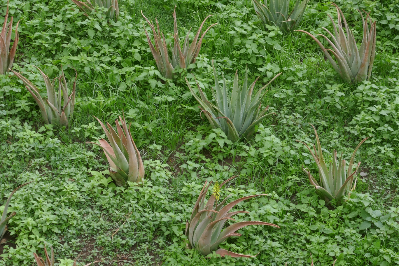 Unterwegs kommen wir auch an einer Aloe-Farm vorbei; auf den Feldern stehen schön gepflegt Aloe-Pflanzen, einige blühen. Was zunächst ausschaut wie ein kleiner Betrieb, zeigt sich beim kurzen Stopp als ein Betrieb, der sich auf Busgruppen spezialisiert hat – also Präsentation und Verkauf für Touristengruppen.