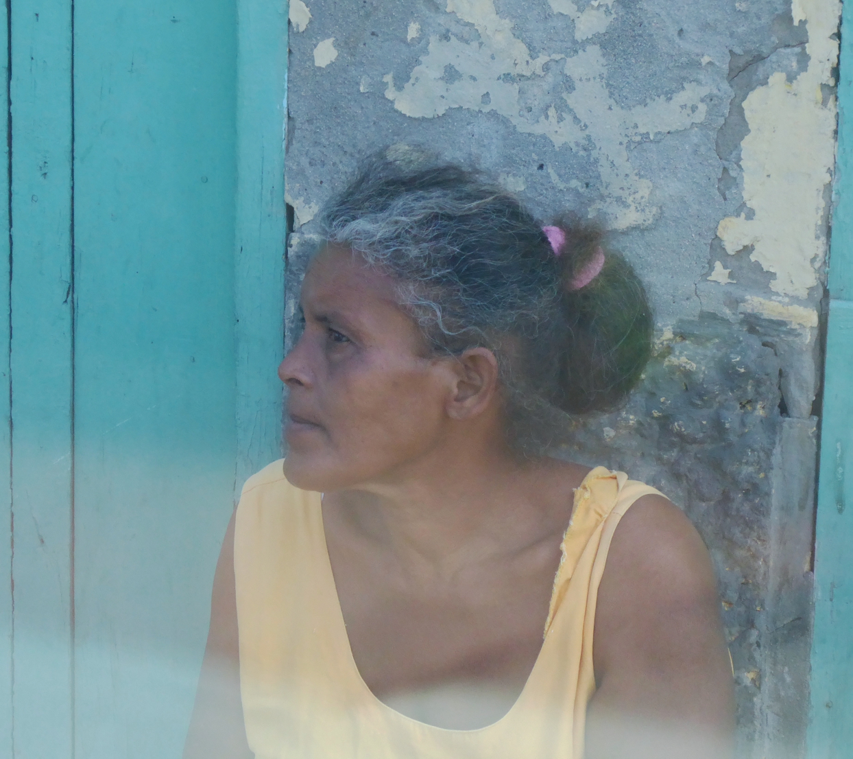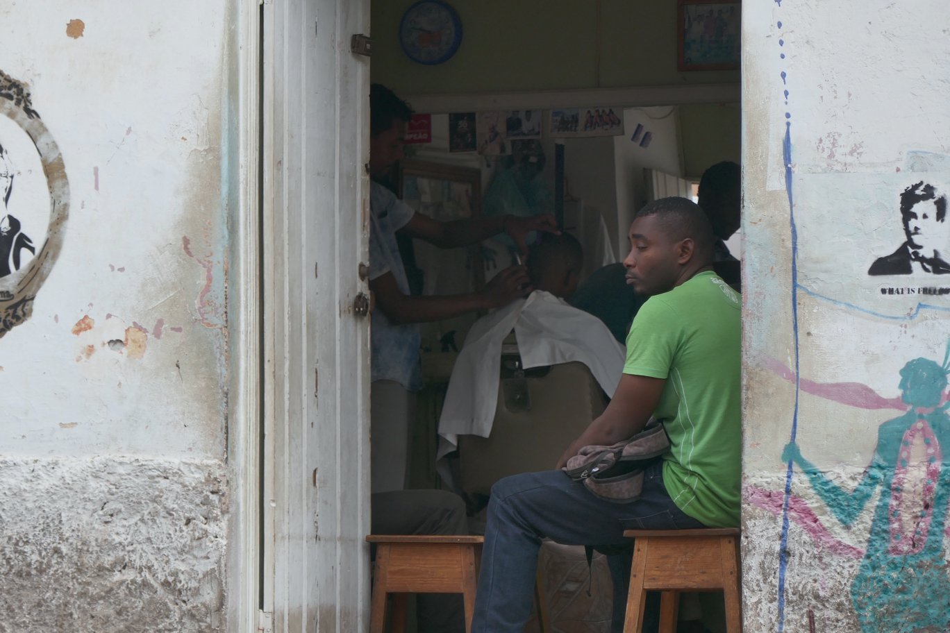 Oben angekommen, gehen wir ein wenig kreuz und quer durch die Gassen, wechseln einige Escudos ein und setzen uns in ein Staßencafè. Die junge Dame, die den Service macht, hat vergessen, das Schild umzuhängen „please do not disturb“. Wir genießen trotzdem unseren Kaffee mit Blick auf einen stylischen Friseurladen und laden noch eine sehr alte Dame, die auf einem Stock gestützt gerade sehr langsam um die Ecke kommt, auf eine Tasse Kaffee ein – schade, dass wir uns nicht auf irgendeine Weise mit ihr unterhalten können.