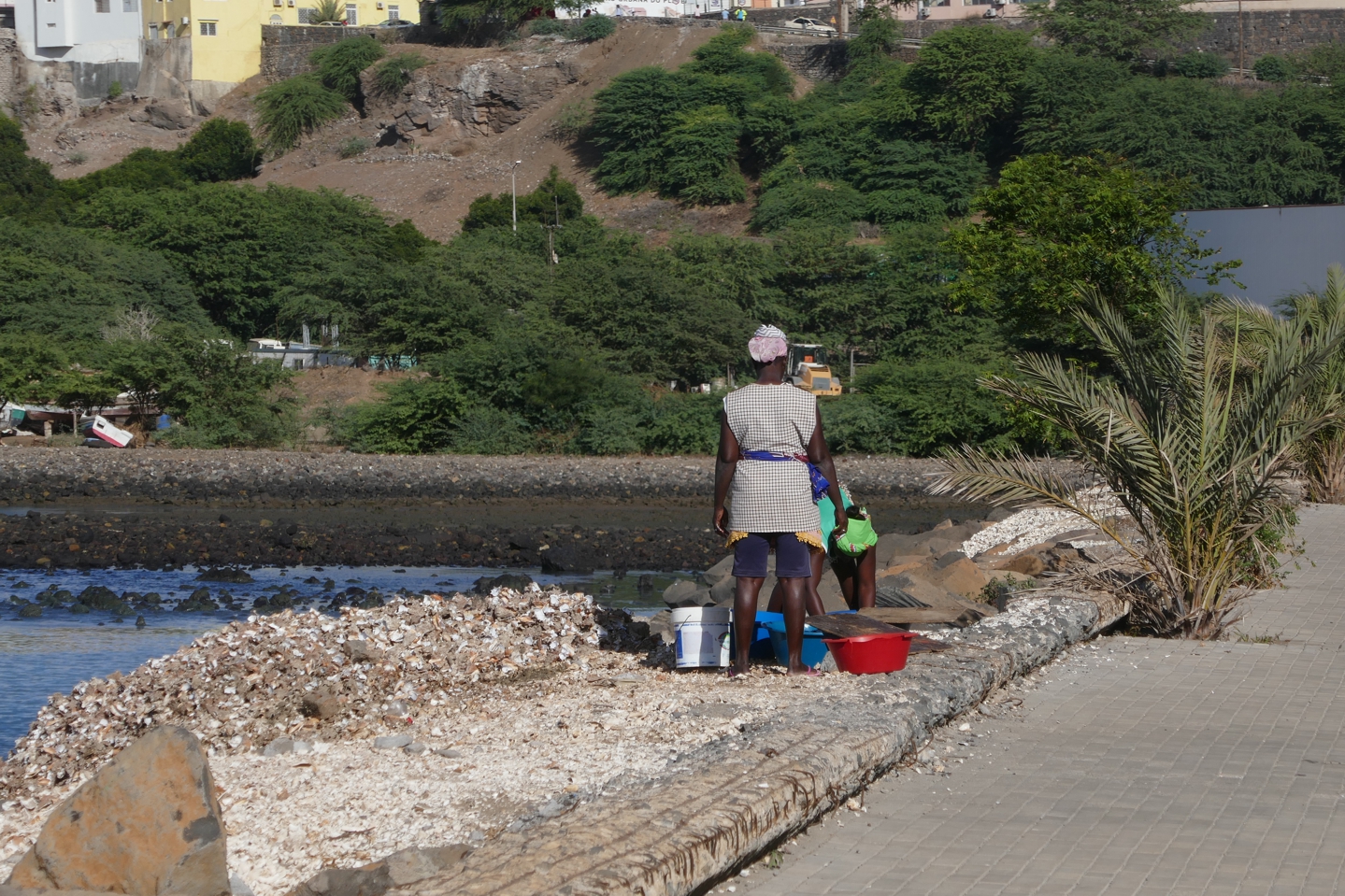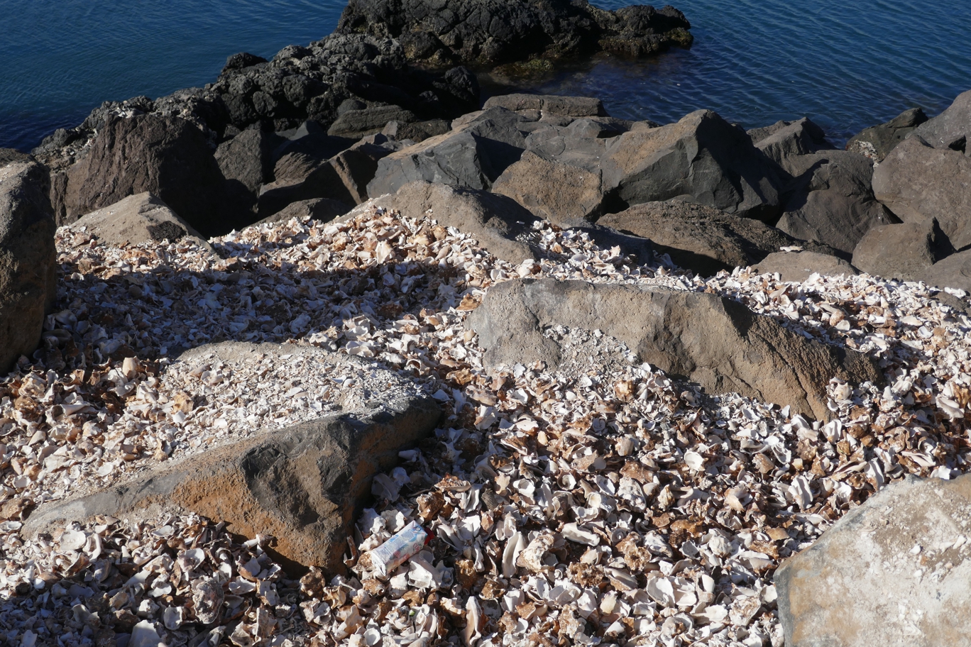 Ein Stück weiter an der Uferpromenade scheint der Platz zu sein, an dem Meeresschneckenfischer oder -sammler regelmäßig die Schnecken aus ihren Häusern knacken – anders kann man sich das nicht vorstellen, wenn man sich die stabilen, massiven Schneckenhausreste genauer anschaut. Zwei Frauen sind gerade fertig und machen sich auf den Weg in Richtung Stadt.
