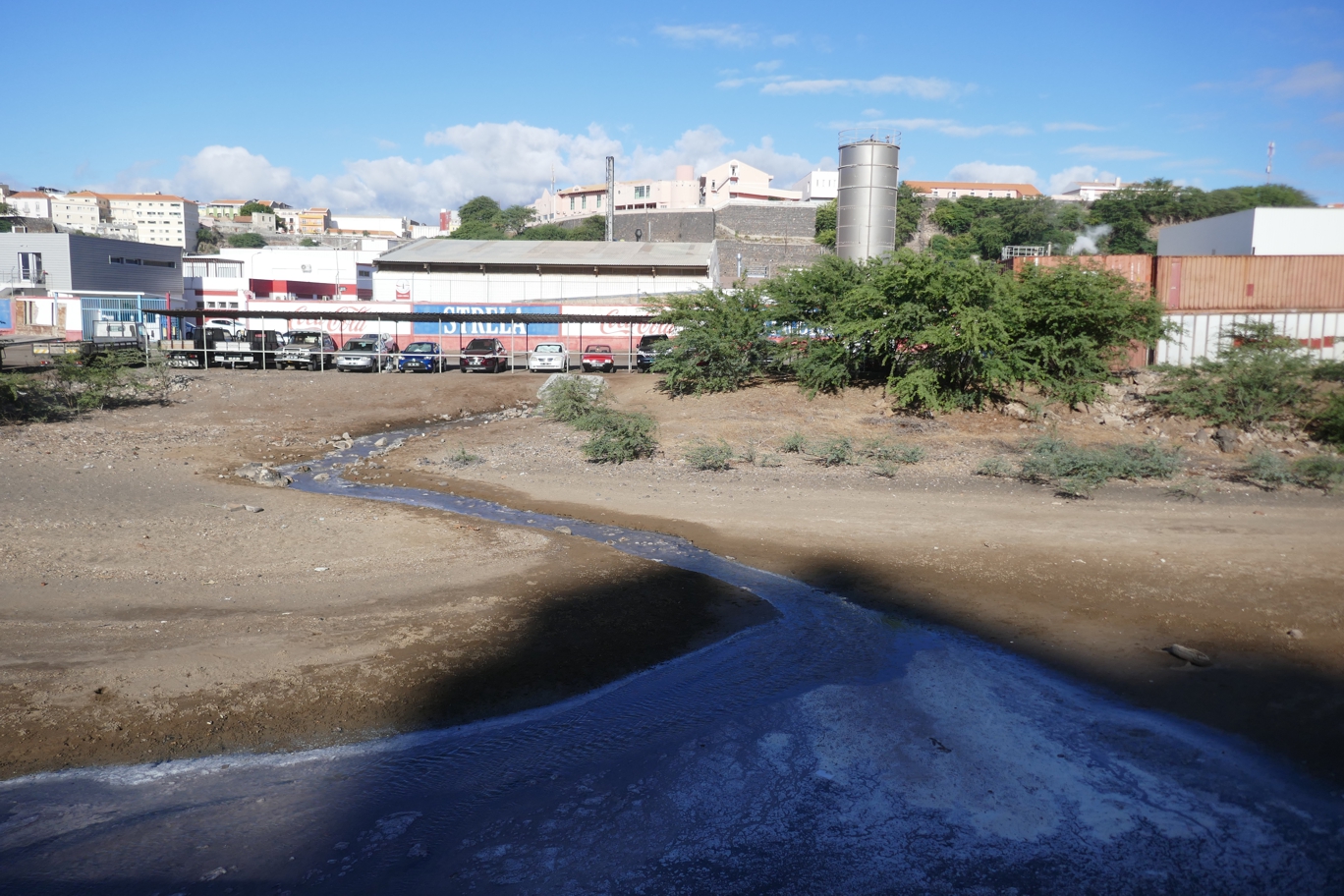 Vorbei an einer Coca-Cola-Abfüllstation geht es an einem kleinen Fluss in Richtung Innenstadt. Das wenige Wasser, das fließt, hat ziemlich unterschiedliche Farbgebung, die auf alles hindeutet, nur nicht auf Wasser. Teilweise steht Schaum oben auf, und es riecht schrecklich nach einer Mischung von Schwefel und Kloake. Das nicht sonderlich saubere Rinnsal kommt von weiter oben; der größte Zulauf kommt aus der Abfüllstation.