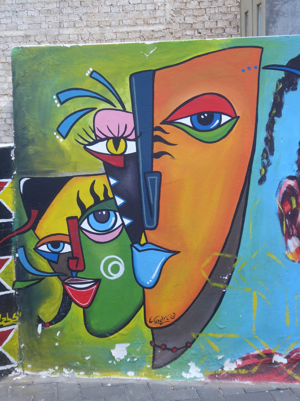 Die Wände und Zäune sind bemalt; beim näheren Hinsehen bemerken wir auch, dass die Treppenstufen, die hinunter zu einem weiter unten liegenden Stadtviertel führen, auch bunt bemalt sind.