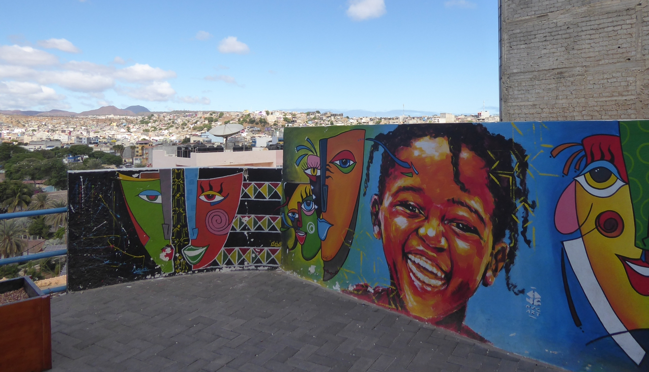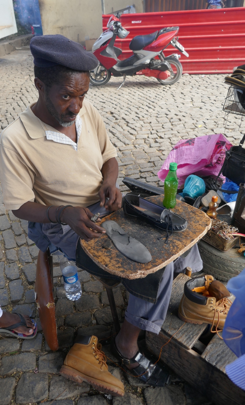 Für uns geht es heute weiter durch die Straßen und Gassen von Praia, der Hauptstadt der Kapverden. In der Nähe des hinteren Ausgangs der Markthalle scheint sich ein Künstler niedergelassen zu haben.