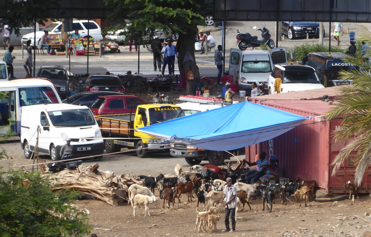 Nochmals geht es auf eine Runde durch die Stadt. Noch sind wir im Außenbereich; entlang der Straße wird Obst und Gemüse verkauft, auf einem Parkplatz mit ein wenig Grün stehen Autos und auch Ziegen.