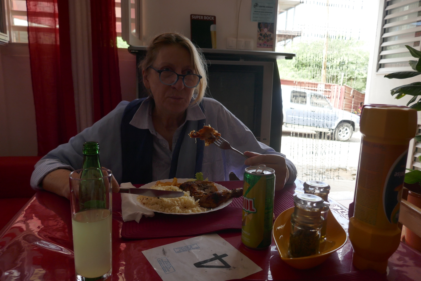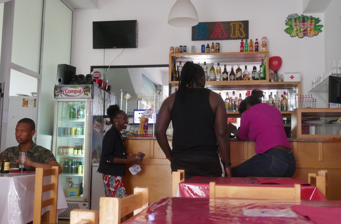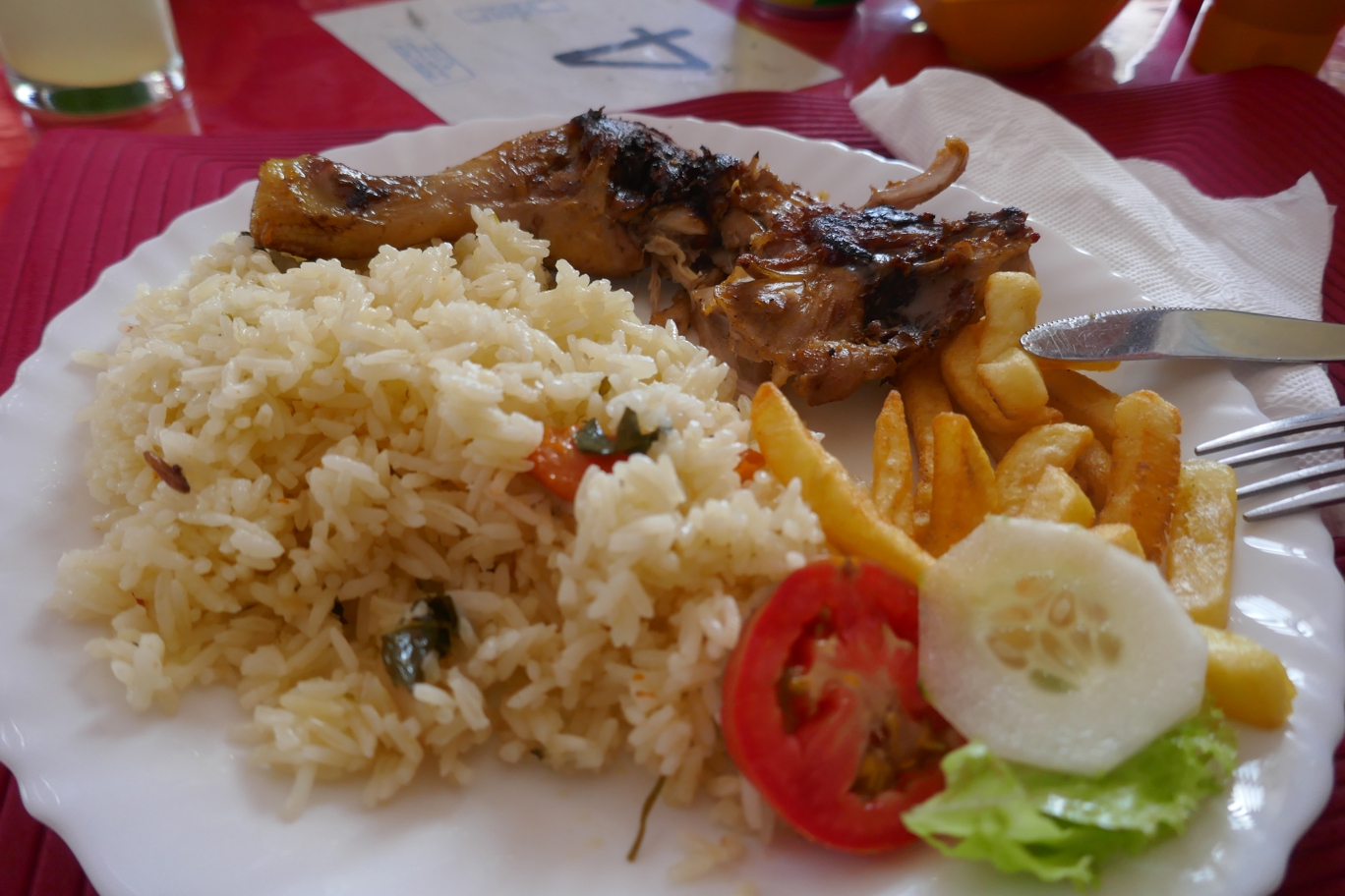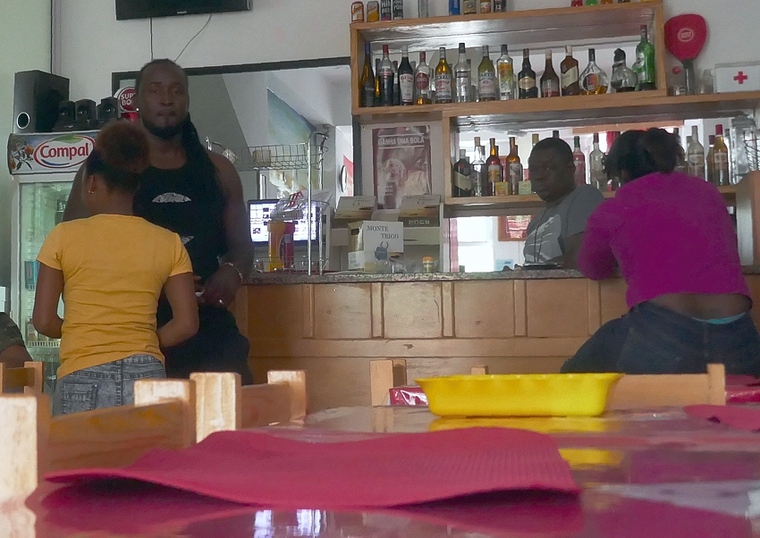 Zuerst werden wir mit Getränken und Lebensgeschichte versorgt, über Frau und Kind, den Job als Bodyguard, dass er eigentlich in Nairobi arbeitet und hier sei wegen der Hochzeit seiner kleinen Schwester, und so weiter. Alles nett und unterhaltsam. Das Essen ist ein Hühnerbeinchen mit viel Reis und Pommes; ordentlich gekocht, das Huhn sicherlich für kapverdische Verhältnisse etwas richtig Gutes, bei uns wäre es gerade für eine Suppe durchgegangen. Unserem Bodyguard gefällt unser Gespräch so sehr, dass er uns am liebsten durch die Stadt begleiten würde. Aber so richtig in unserem Sinne ist das nicht, wir ziehen alleine weiter, und wir hoffen, dass er das versteht.