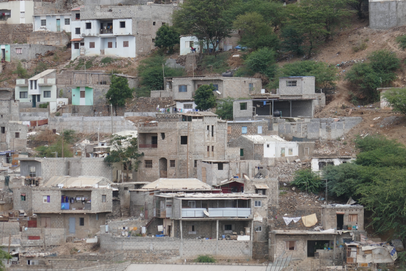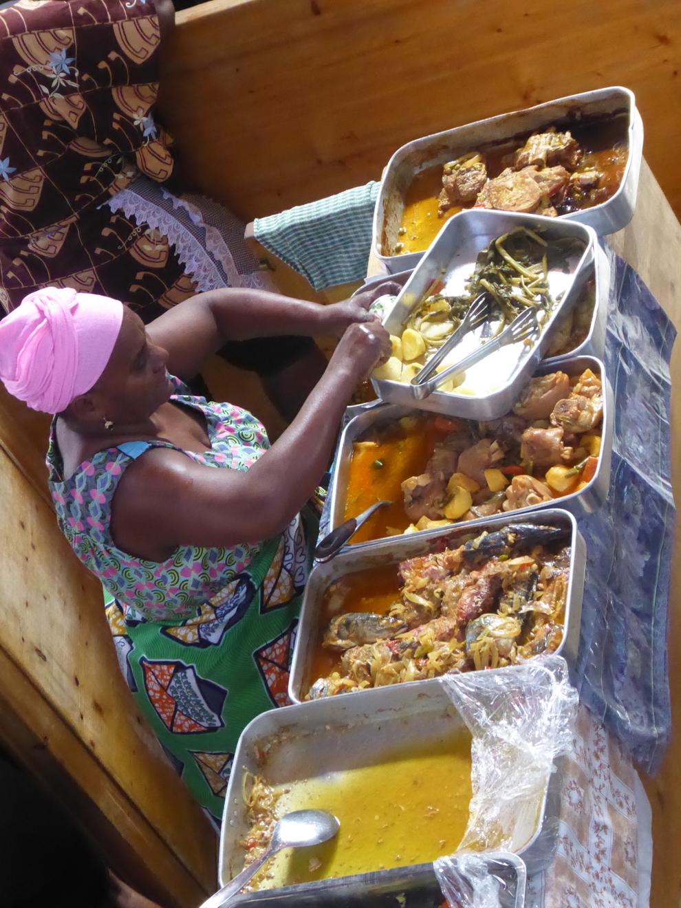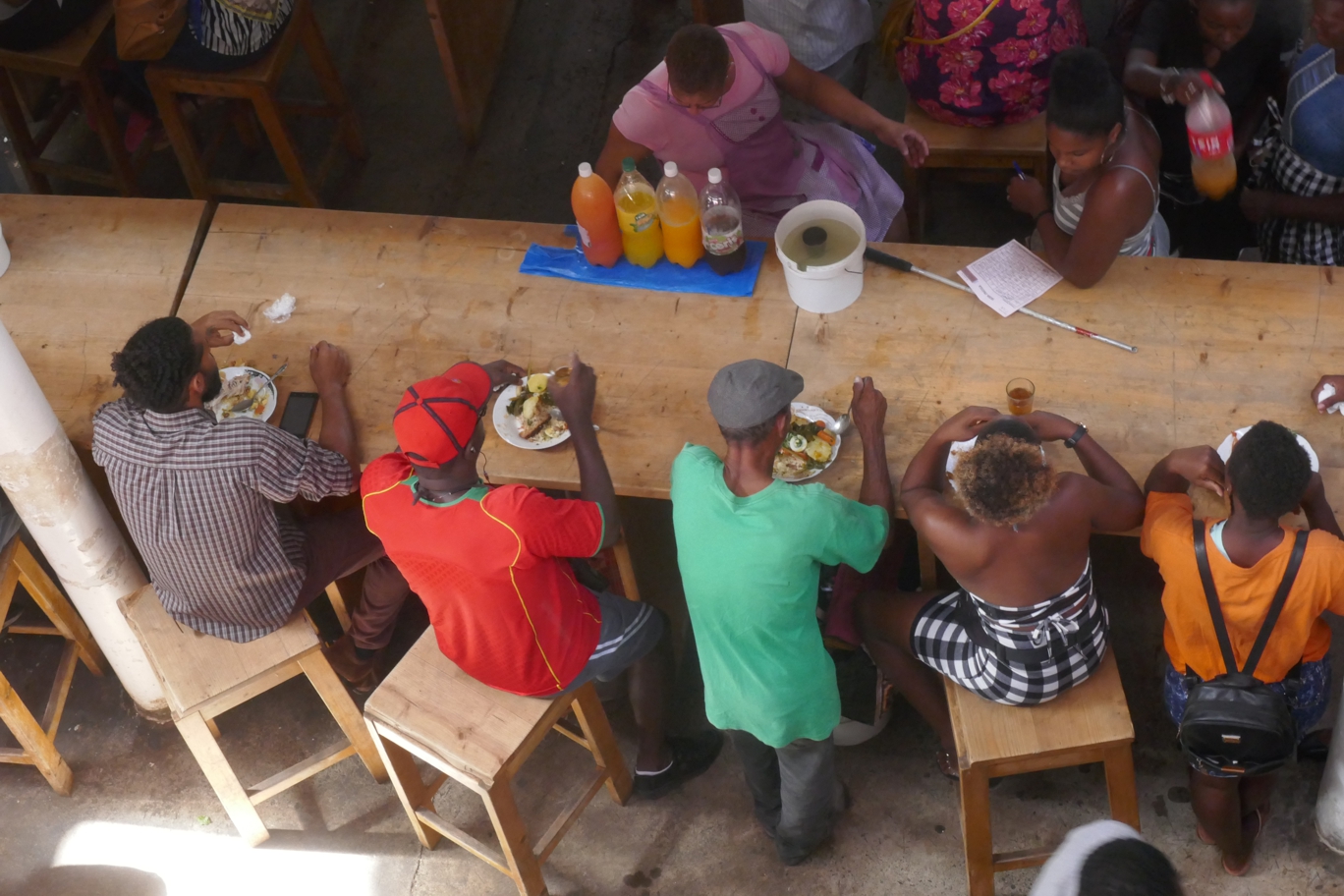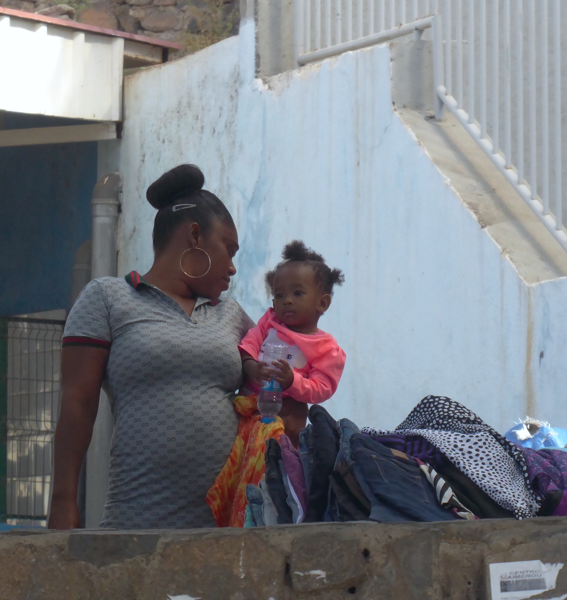 Zuerst werden wir mit Getränken und Lebensgeschichte versorgt, über Frau und Kind, den Job als Bodyguard, dass er eigentlich in Nairobi arbeitet und hier sei wegen der Hochzeit seiner kleinen Schwester, und so weiter. Alles nett und unterhaltsam. Das Essen ist ein Hühnerbeinchen mit viel Reis und Pommes; ordentlich gekocht, das Huhn sicherlich für kapverdische Verhältnisse etwas richtig Gutes, bei uns wäre es gerade für eine Suppe durchgegangen. Unserem Bodyguard gefällt unser Gespräch so sehr, dass er uns am liebsten durch die Stadt begleiten würde. Aber so richtig in unserem Sinne ist das nicht, wir ziehen alleine weiter, und wir hoffen, dass er das versteht.