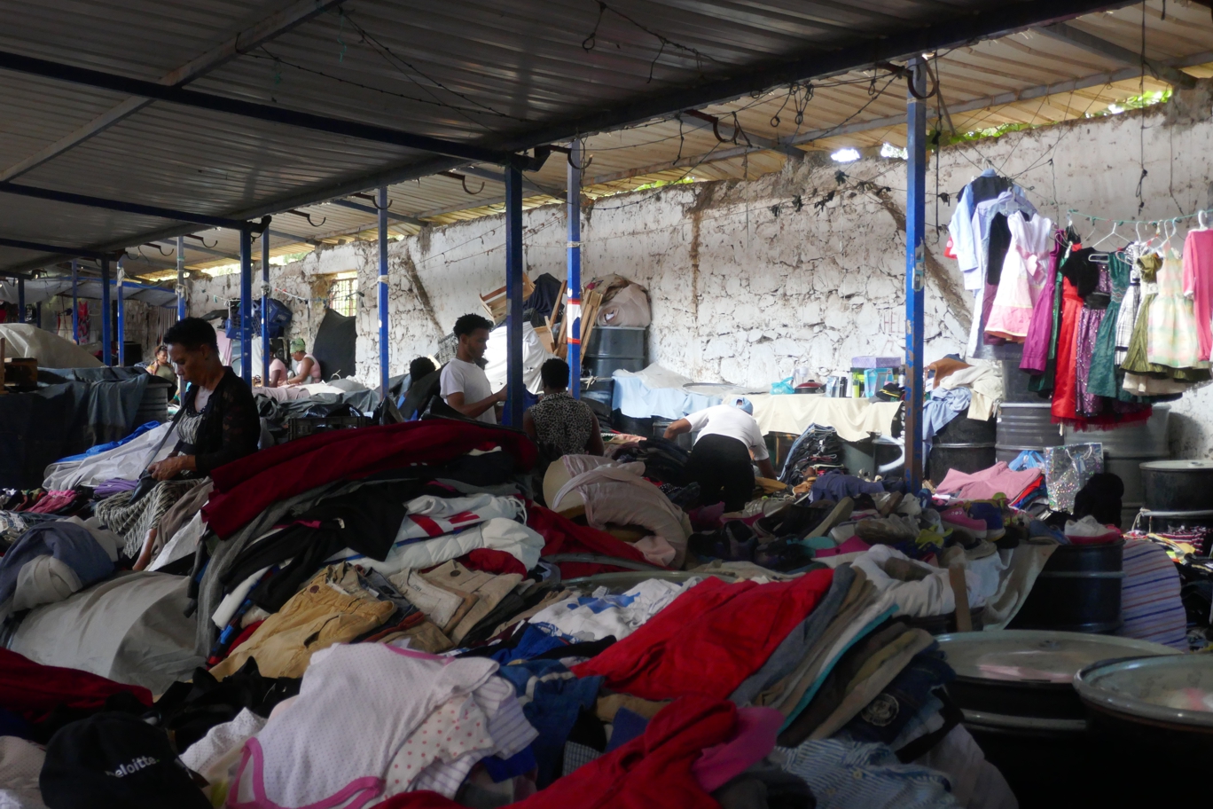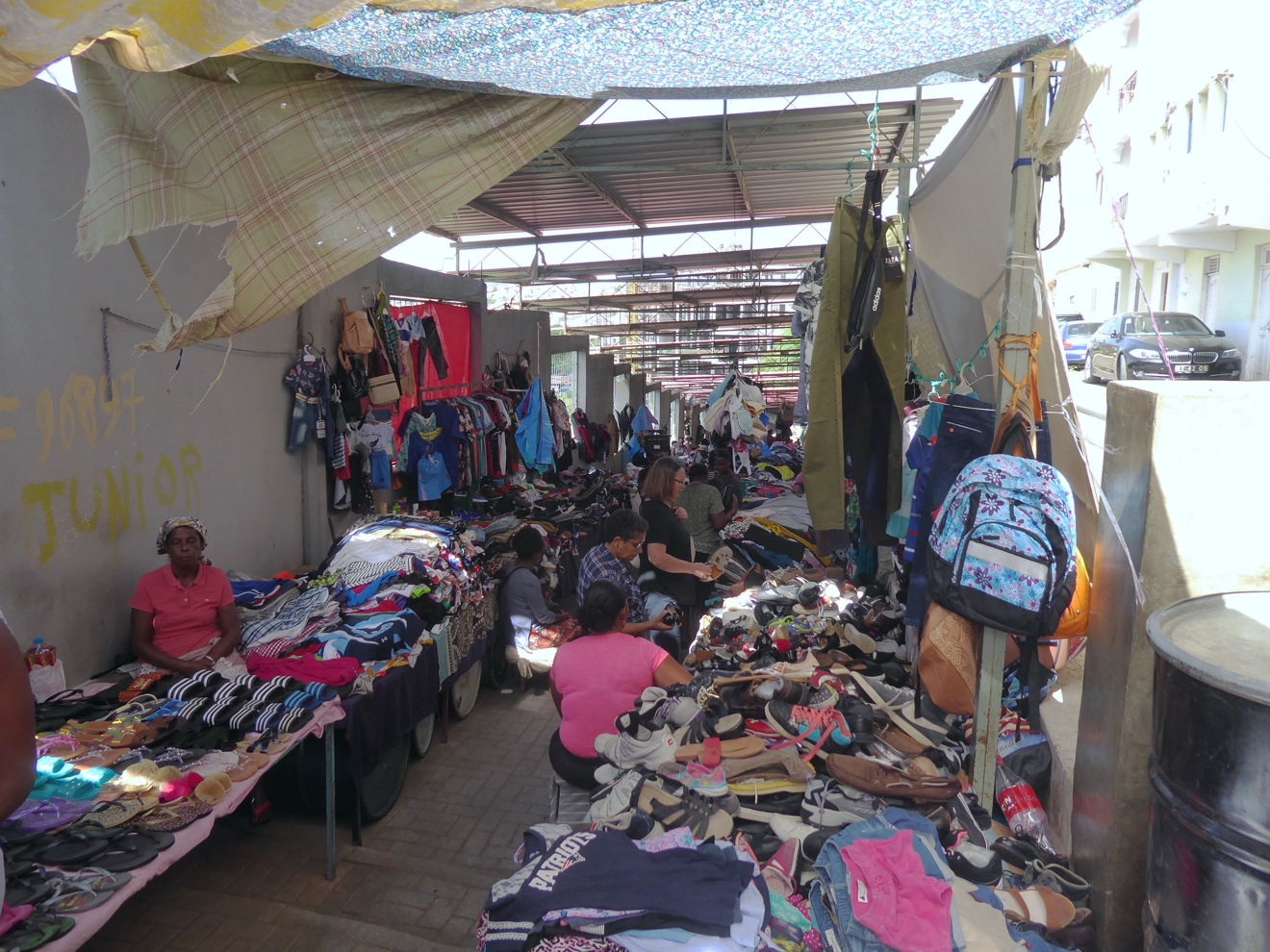 Und dann ein riesiger Bereich mit Second-Hand-Kleidung; hier kommt sicherlich ganz vieles von dem an, was bei uns Zuhause in den Containern landet und auf welchem Wege auch immer kommend dann auf den Kapverden in den Verkauf gelangt. Und was denjenigen das Leben schwer macht, die im letzten Drittel der Halle versuchen, ihr Geschäft zu machen.