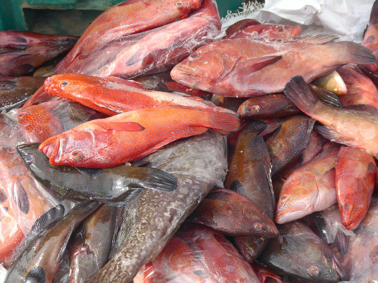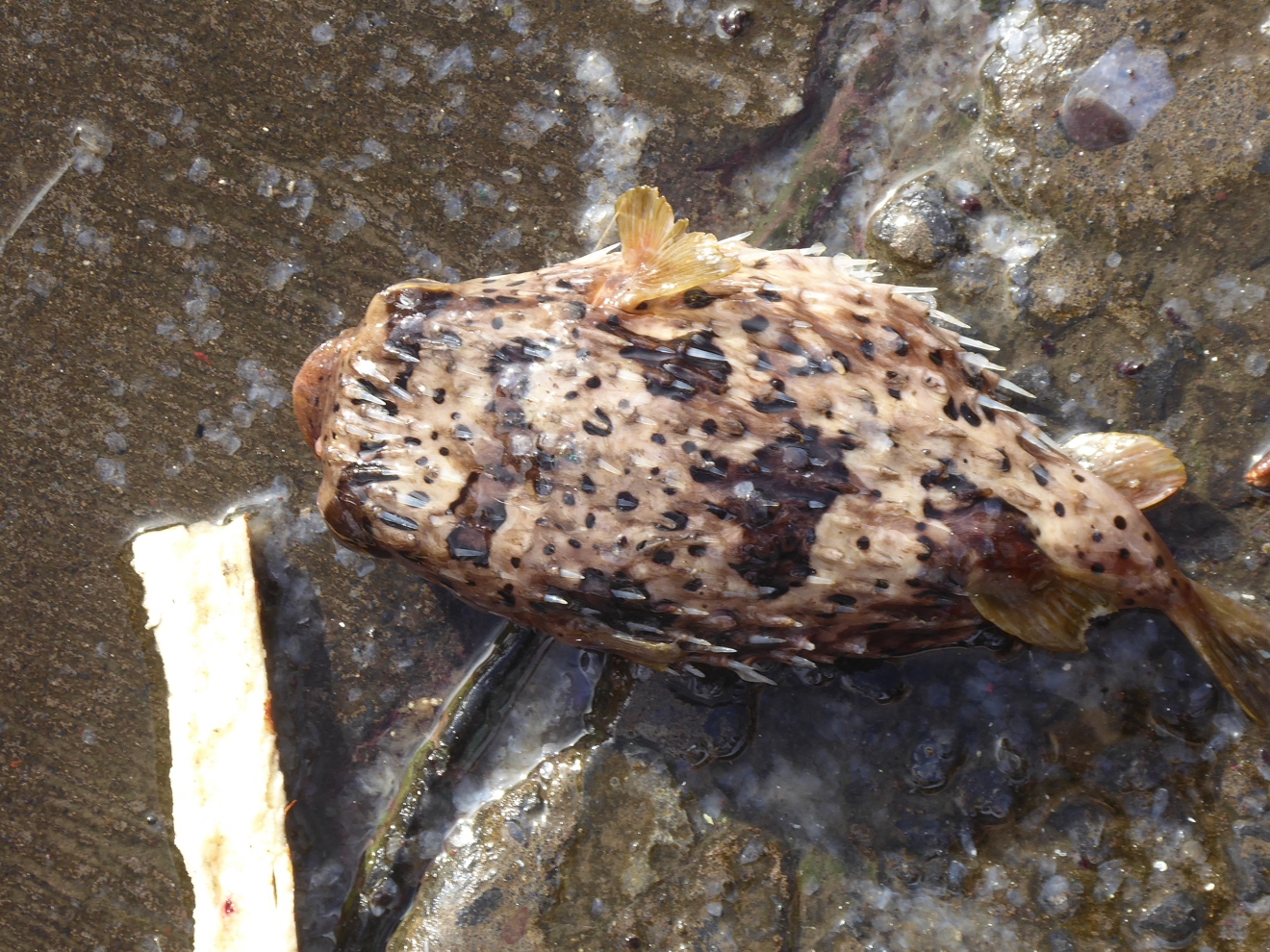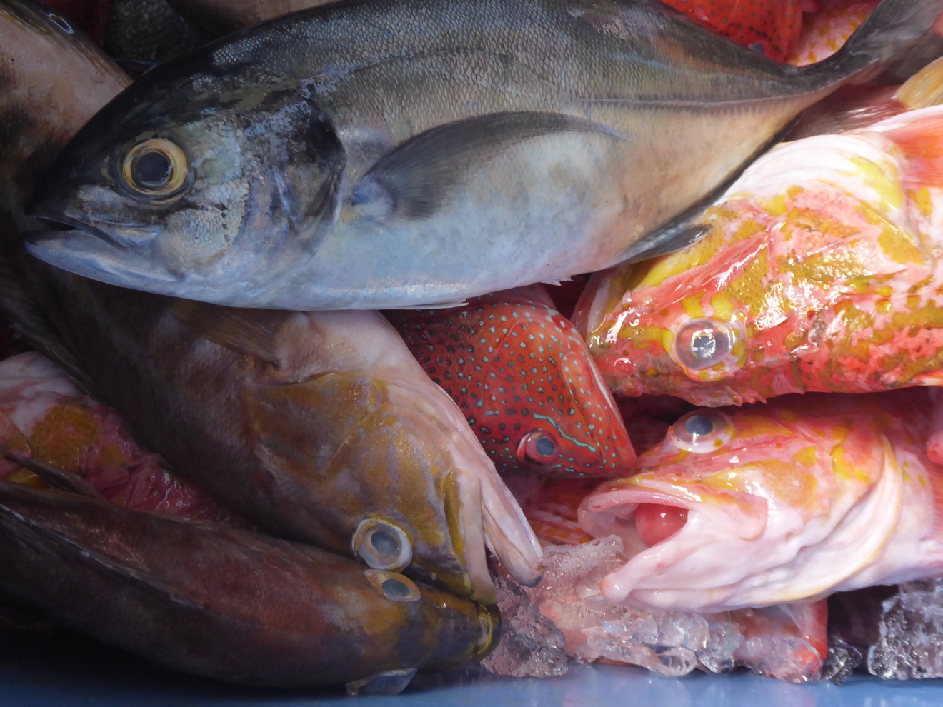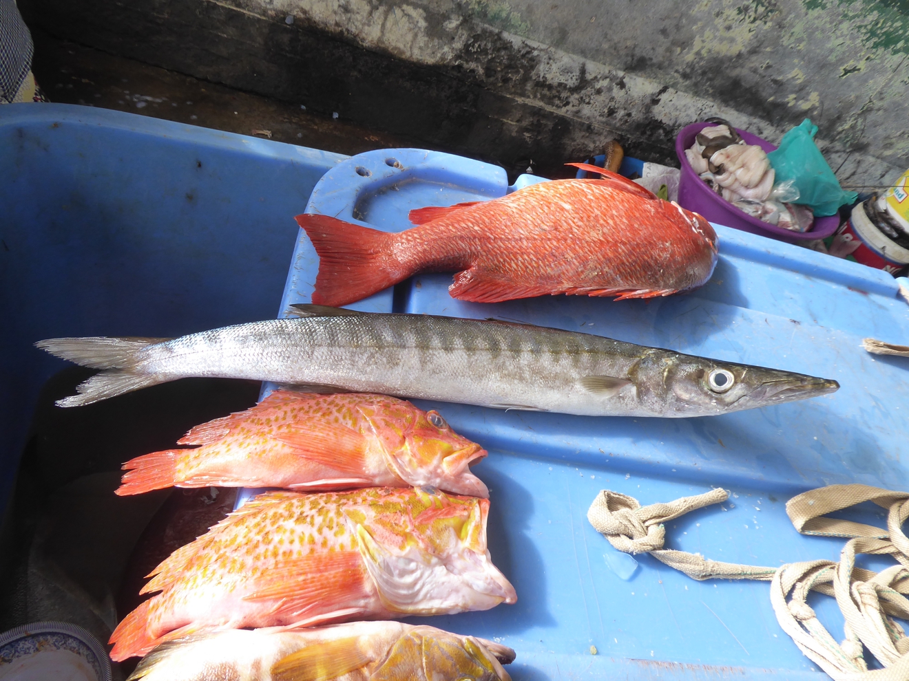 Auch er zeigt uns seinen Fang; er scheint später zurückgekommen zu sein, da der Bestand noch ziemlich groß ist. Bei ihm steht ein fast voller Behälter voller großer und kleiner Fische in verschiedensten Farben. Die meisten schillern in verschiedenen Rot-Tönen, die farbenfrohesten leuchten geradezu in einem intensiven orangerot mit türkisen, leicht schwarz umrandeten Punkten. Ein Kugelfisch liegt eher unbeachtet auf dem Boden – er ist wohl als unbrauchbar eingestuft.