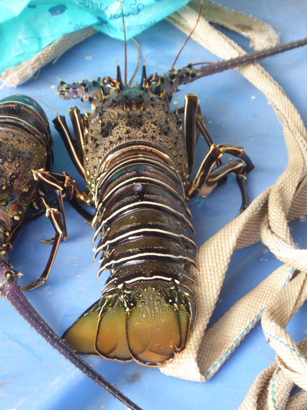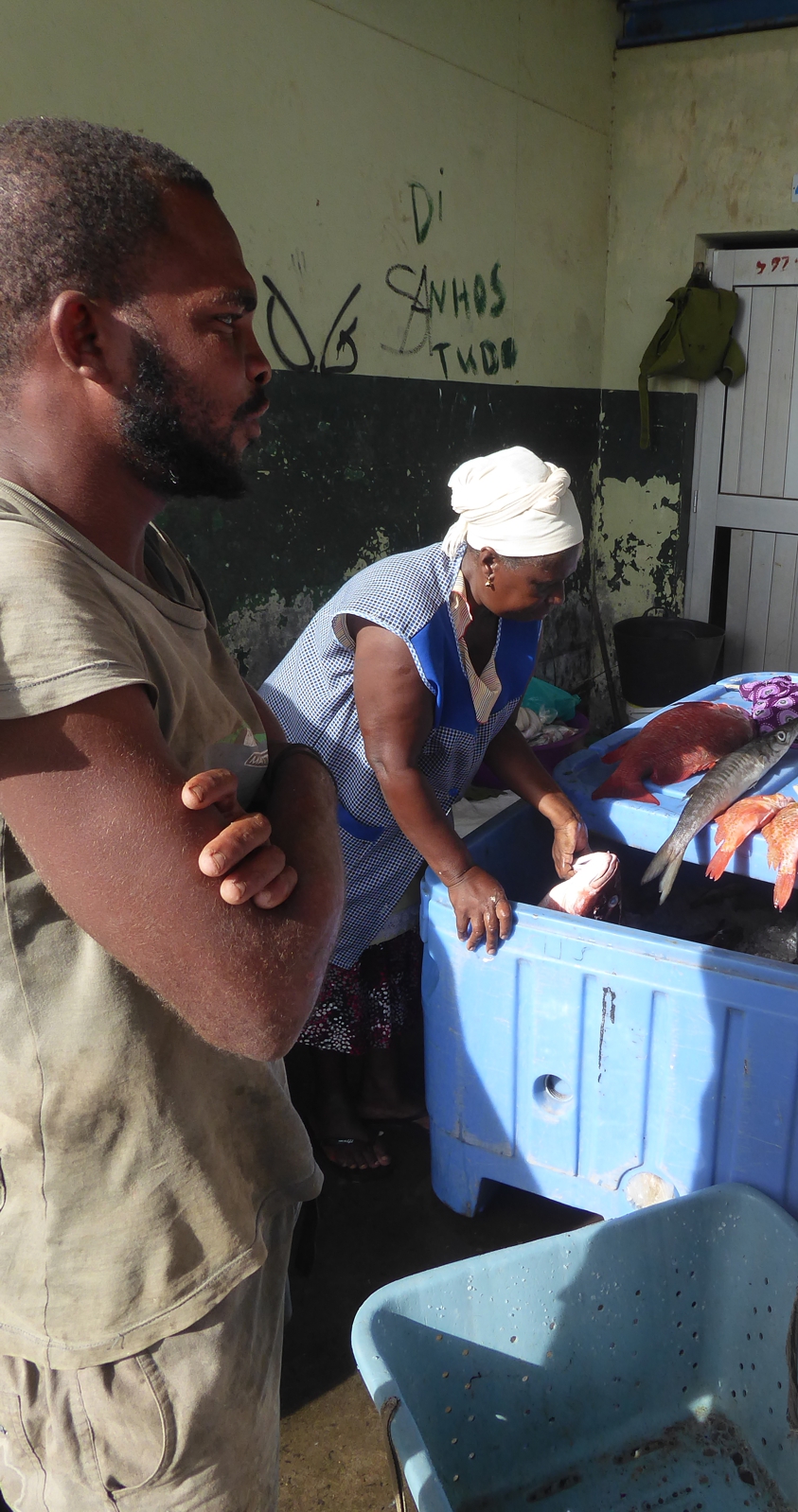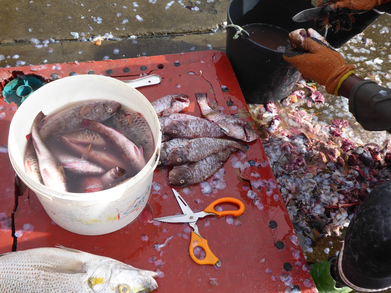 Eine ältere Dame ist am Putzen von Fischen; er stellt sie uns als seine Mutter vor. Daneben steht die Tante, dann kommt noch der Bruder, und dann erfahren wir noch, dass der Bruder aktuell einen Sohn bekommen hat. Die Mutter stellt uns alle Fische mit Namen vor – leider lässt sich das alles nicht verstehen und merken. Was für uns überraschend war: Viele der Fische werden mit Speer oder Harpune gefangen; der Fischer zeigt uns die Stelle am Kopf, wo er treffen muss. Der andere Teil des Fangs erfolgt mit Angelhaken, die an langen Schnüren hängen, und mit Netz.