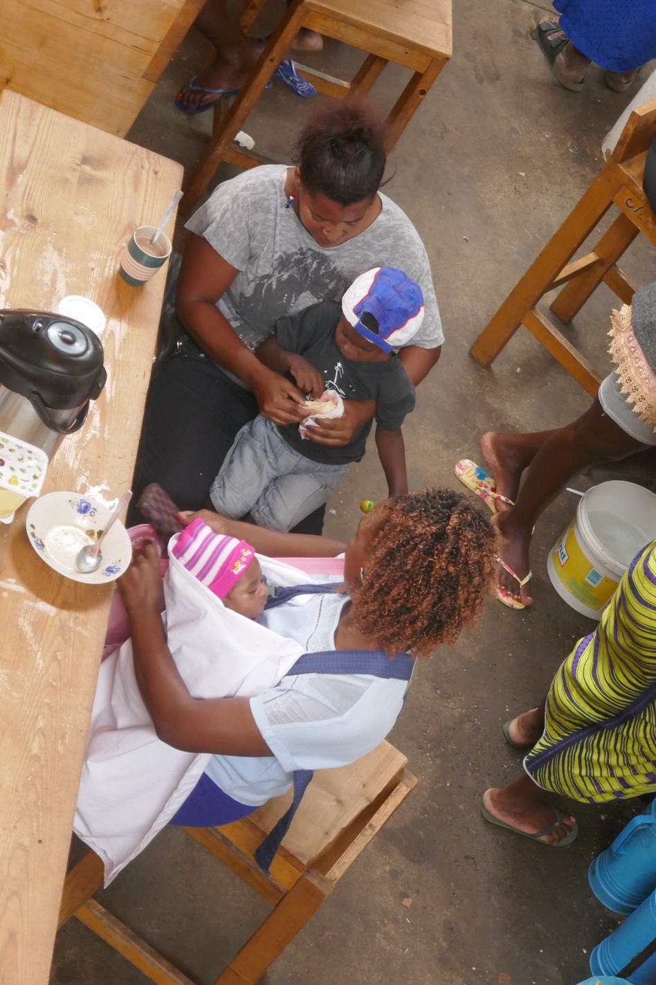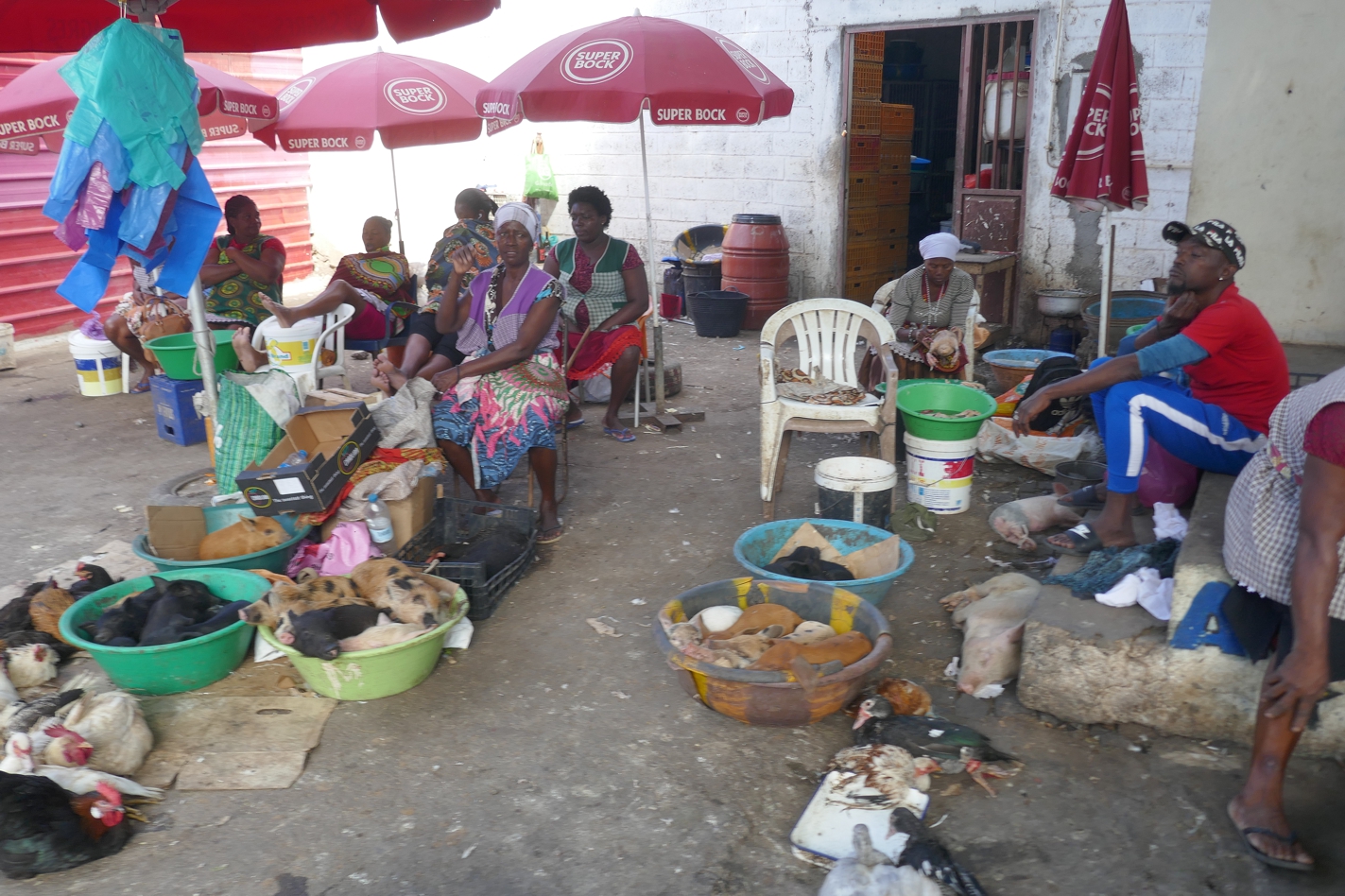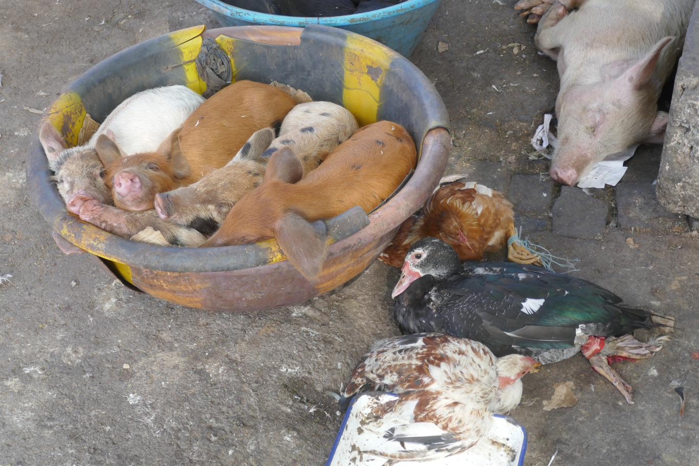 Vor der Halle sehen wir zuerst einmal einen Schuster; der repariert Lydias kaputten Schuh. Nebenan werden von einigen Frauen Hühner, Enten und Schweine verkauft, die Frauen recht schlapp in der Sonne sitzend, die Tiere gefesselt und ebenso schlapp in der Sonne liegend.