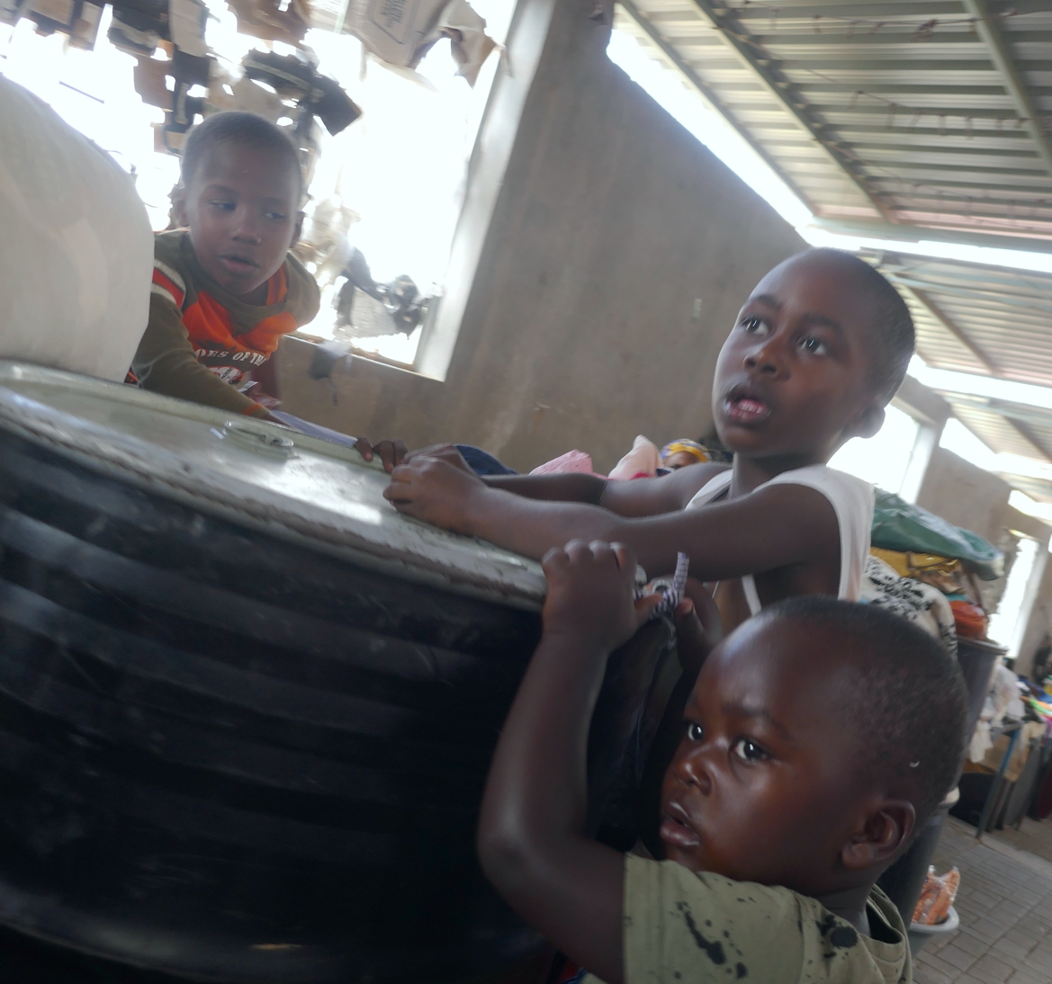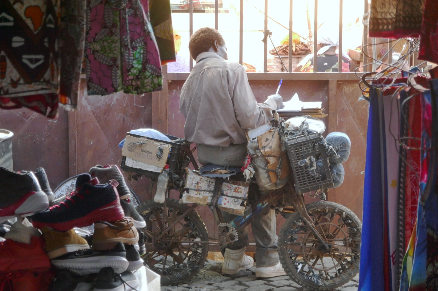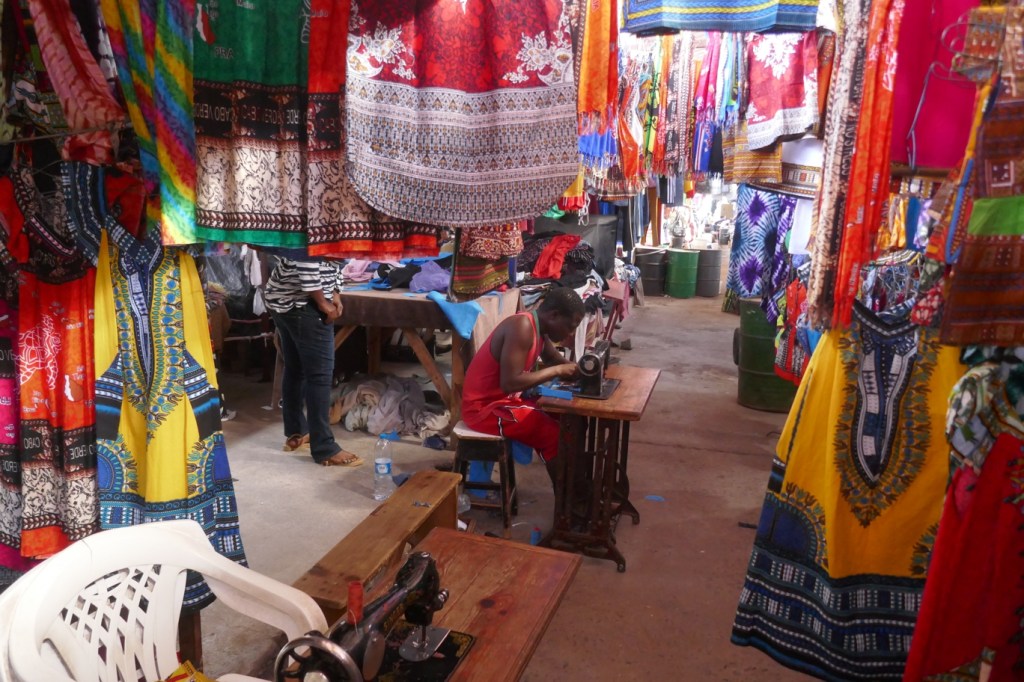 Hier sind unzählig viele Schneider. Jeder von ihnen hat ein paar Quadratmeter Halle, eine Nähmaschine, manchmal manuell, manchmal elektrisch. Um sie herum hängt all das, was sie produziert haben; irgendwo liegt immer ein Stapel mit Stoffen. Alles ist herrlich bunt; sie verarbeiten allesamt die typischen afrikanischen Stoffe. Wenn wir es richtig beobachten, arbeiten sie auch in Auftrag. Aber auf Dauer werden sie bei all der asiatischen Billigware und der europäischen Second-Hand-Ware kaum eine Chance haben, zu überleben.