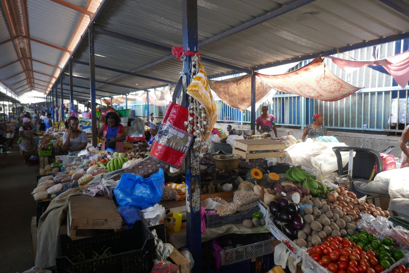 In der Halle dahinter erwartet uns zunächst all das, was auch bei uns Zuhause auf Jahrmärkten zu finden ist – Unmengen billige Unterwäsche, Schuhe, Socken, T-Shirts, Hemden, Hosen, Kleider, die Kleinwaren im Mehrfachpack, alles ziemlich bunt. Dazwischen ist immer mal wieder ein Obst- oder Gemüseverkäufer zu sehen; es scheint die Billig-Importware zu sein.