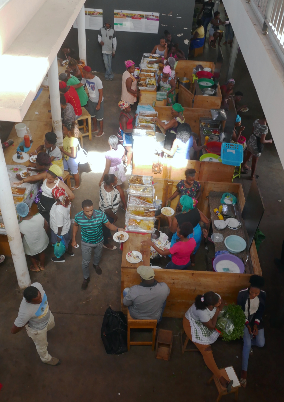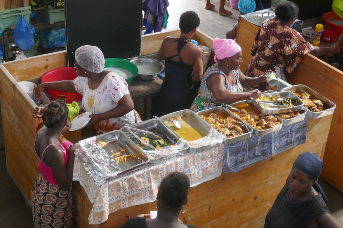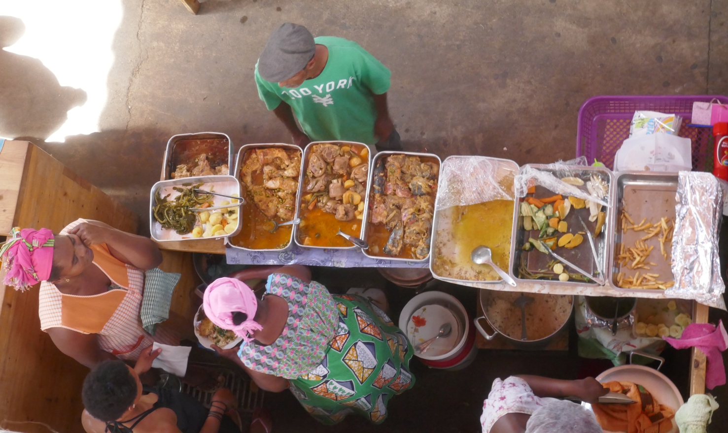 Weiter geht es für uns über inzwischen altbekannte Straßen und den Markt. Dort wird an den Ständen noch gegessen; aber es sind eher die Nachzügler, die jetzt noch kommen – darauf verweisen zumindest die fast durchwegs ziemlich geleerten Töpfe.