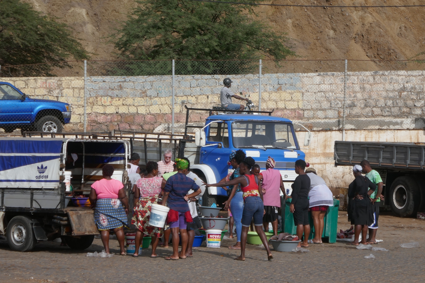 Vor dem Fischereihafen werden vom Lastwagen herunter noch Fische verkauft. Sie scheinen gefroren zu sein oder sie lagen schon länger auf Eis. Die Frauen um die großen Fischbehälter herum kreischen und schreien und zanken; es ist so in etwa die Stimmung wie an einem Wühltisch beim Schlussverkauf, bei dem es angeblich alles günstiger gibt.