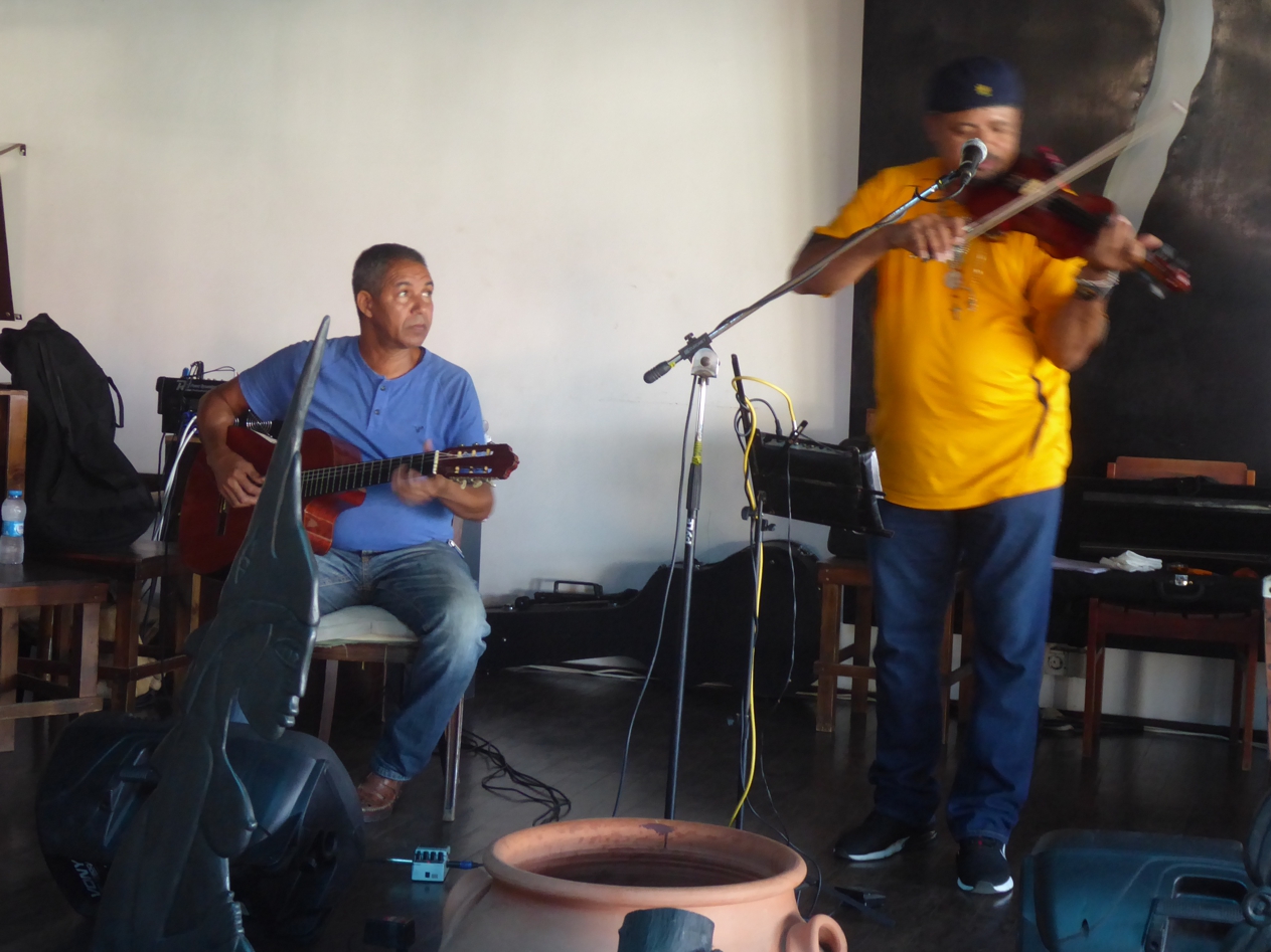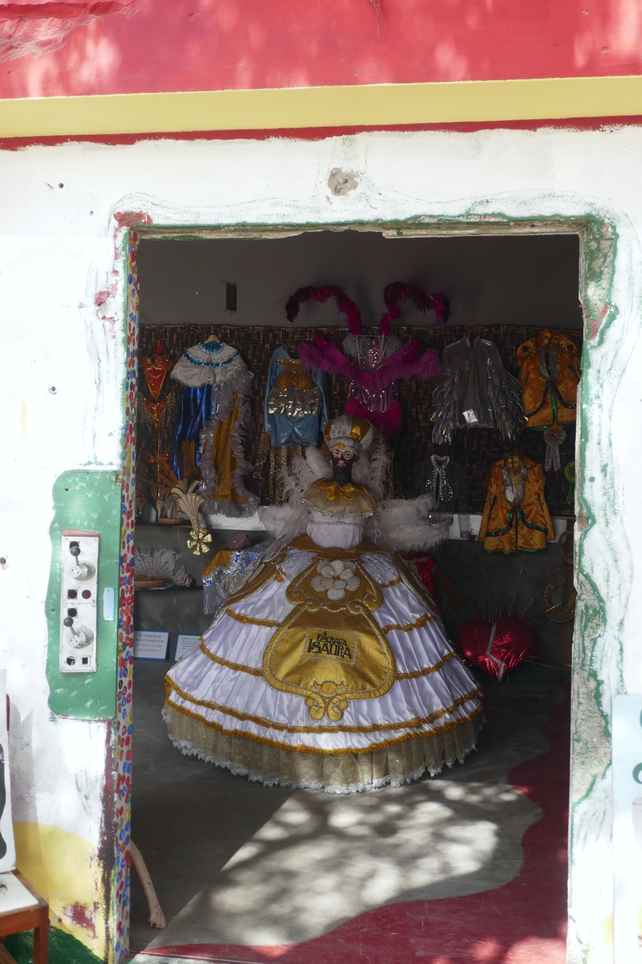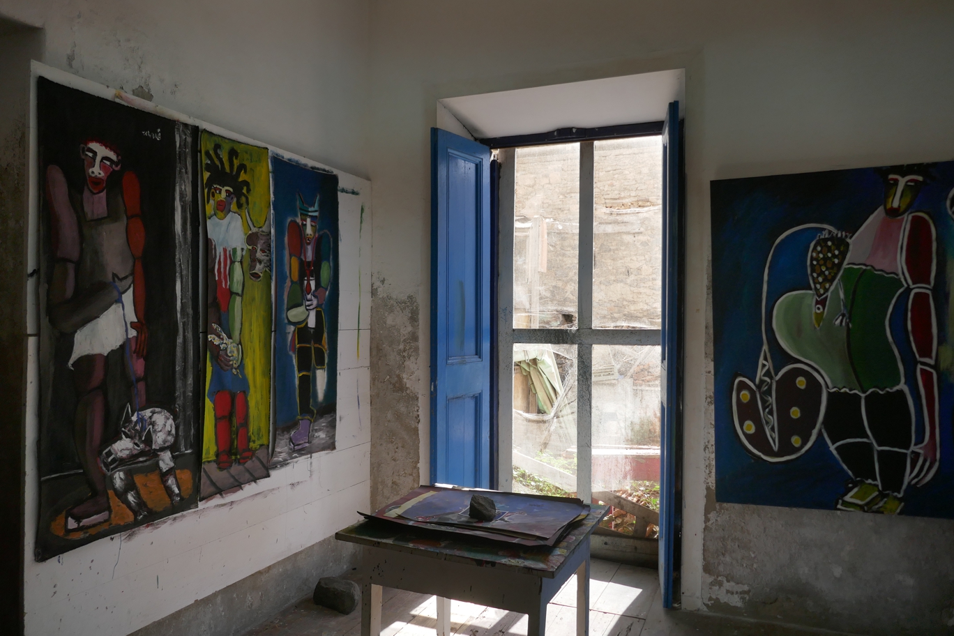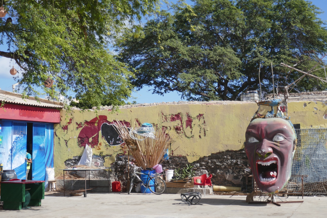 Und noch eine kleine Strecke entlang der Straße gegangen, vorbei an ein paar kleinen Bars, an Verkäuferinnen für Gemüse und Fisch, die auf dem Fußgängerweg sitzen, kommt eine Art Künstlerhof. Durch ein Tor geht es hinein in einen großen Innenhof, in dem Skulpturen stehen, die aussehen als wären sie einem Kinder-Science-Fiction-Film entsprungen. Um den Innenhof herum sind einige Künstlerwerkstätten, bei denen wir nur in einige schnell hinein schauen können.