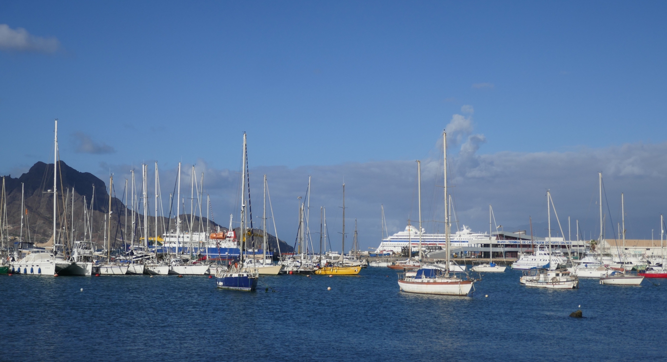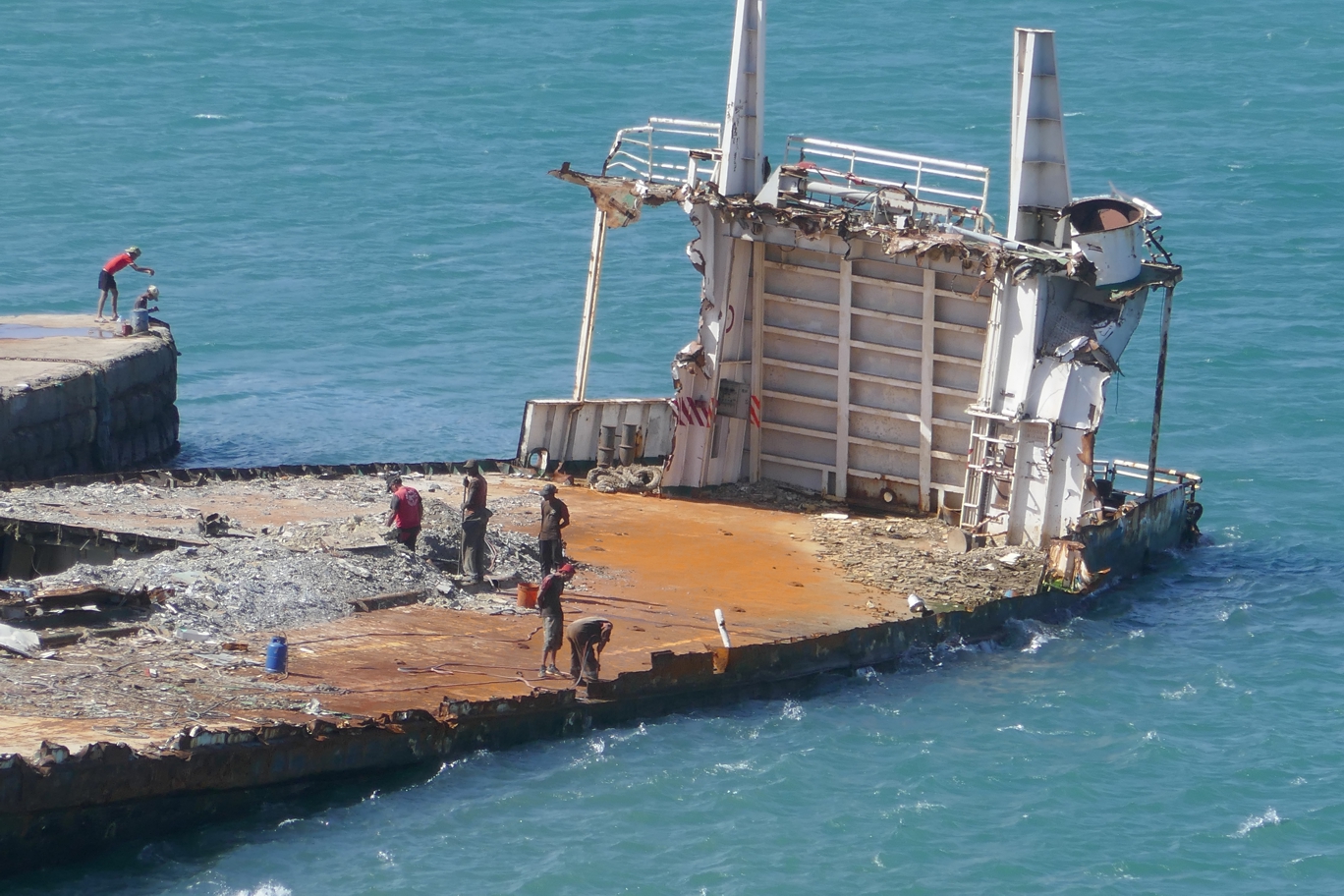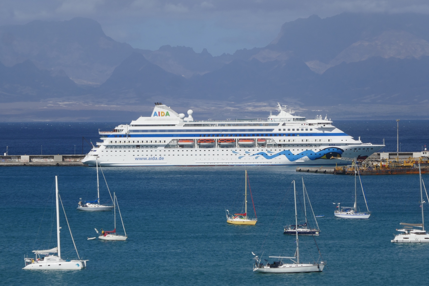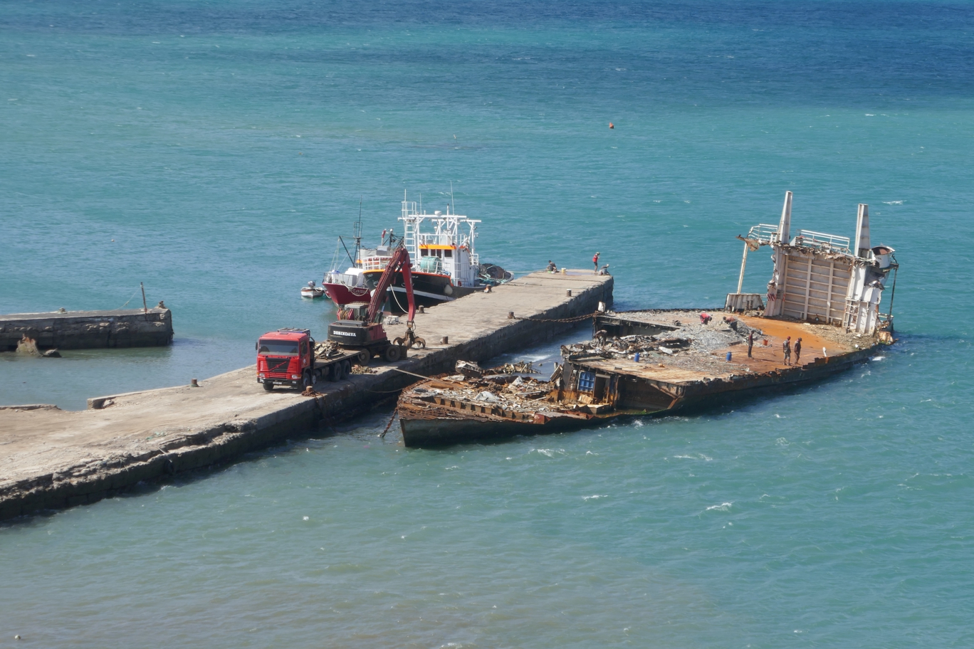 Natürlich sieht man wieder hinunter auf die Bucht, und vorne vor uns liegt die AIDAcara. Nicht weit daneben werden Schiffe repariert und abgewrackt; gerade wird eine nicht ganz kleine Fähre noch in ihre letzten Bestandteile zerlegt. Ein wenig weiter zeigt sich ein herrlicher Strand, direkt in Stadtlage.