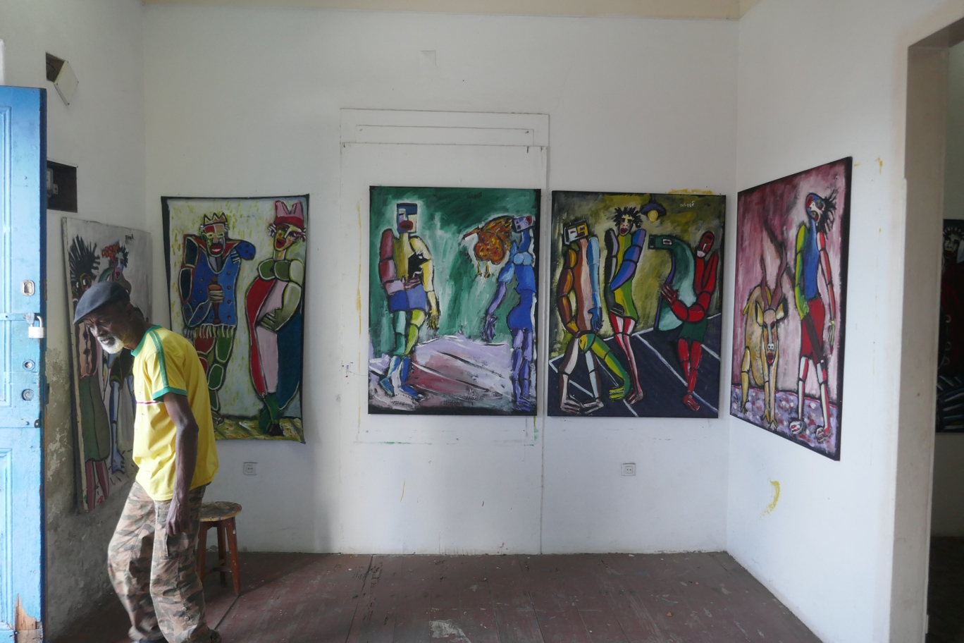 Wieder nebenan: Ein lokaler Künstler, der großflächig und farbenfroh und modern die Geschichte der Inseln verarbeitet; auf den Bildern erkennt man Motive über Arbeit, Partnerschaft, Sklaverei, Unruhen, Krankheit, Landwirtschaft und mehr – aber alles mehr auf den zweiten Blick, zuerst beeindrucken die bunten Farben.