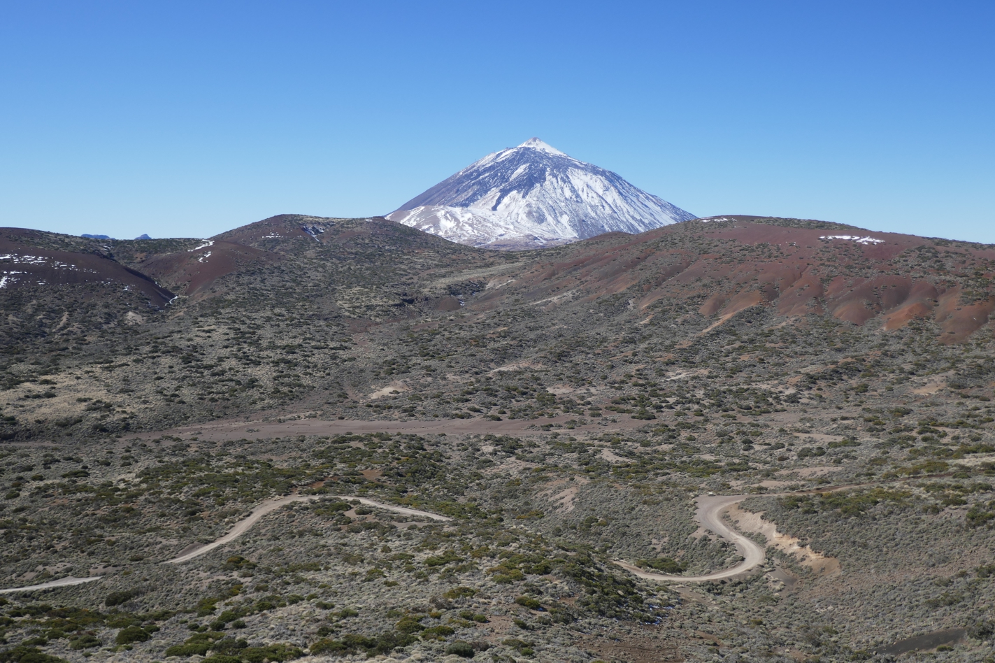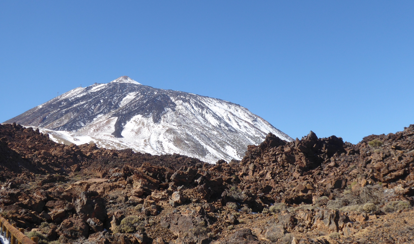 Buschige Kiefern, karge Vulkane, weißer Teide