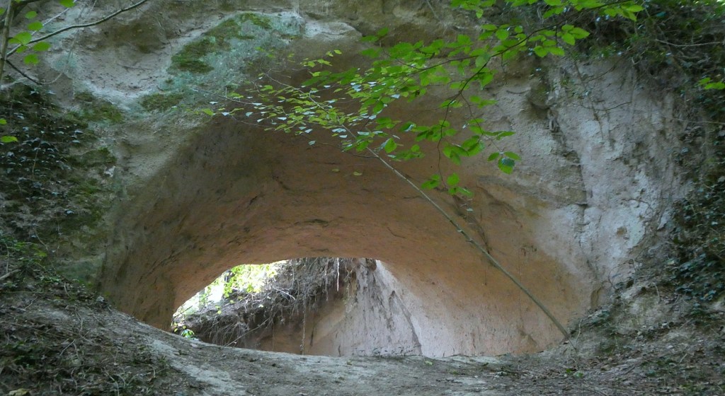 Auf Pfaden geht es von Höhle zu Höhle, dann mal wieder ein wenig in den Wald hinaus und in eine weitere Höhle hinein. Der Berg ist regelrecht durchlöchert. Draußen sieht man einige umgestürzte große Bäume, die sich im brüchigen Untergrund nicht halten konnten, und immer mal wieder eine kleinen Felsabbruch, der weniger nach Fels, mehr nach Sandrutsche ausschaut.
