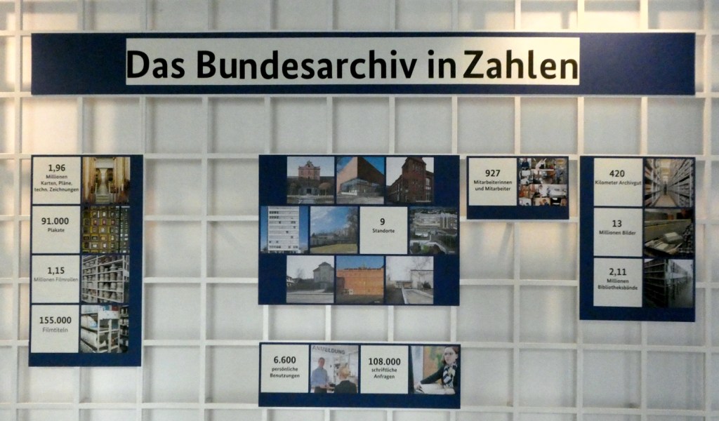 Insgesamt sind es beeindruckende 420 Kilometer Archivmaterial, davon 330 Kilometer Akten, der Rest Filme, Plakate, Bilder und Tonaufzeichnungen. Gegründet wurde das erste Reichsarchiv 1919 in Potsdam; hinterlegt wurden Akten ab etwa 1871. Anlass der Gründung war die Dokumentation des 1. Weltkriegs. Obwohl einiges noch in Sicherheit gebracht werden konnte, wurde ein Drittel des Bestands im 2. Weltkrieg im Februar 1945 bei einem Bombenangriff vernichtet. 1945 wurden die Akten von den Alliierten beschlagnahmt; bei Gründung des Bundesarchivs wurden die Akten von den westlichen Alliierten zurückgegeben. Die Akten aus der damaligen sowjetischen Zone konnten erst nach Wiedervereinigung dem Bundesarchiv eingegliedert werden.