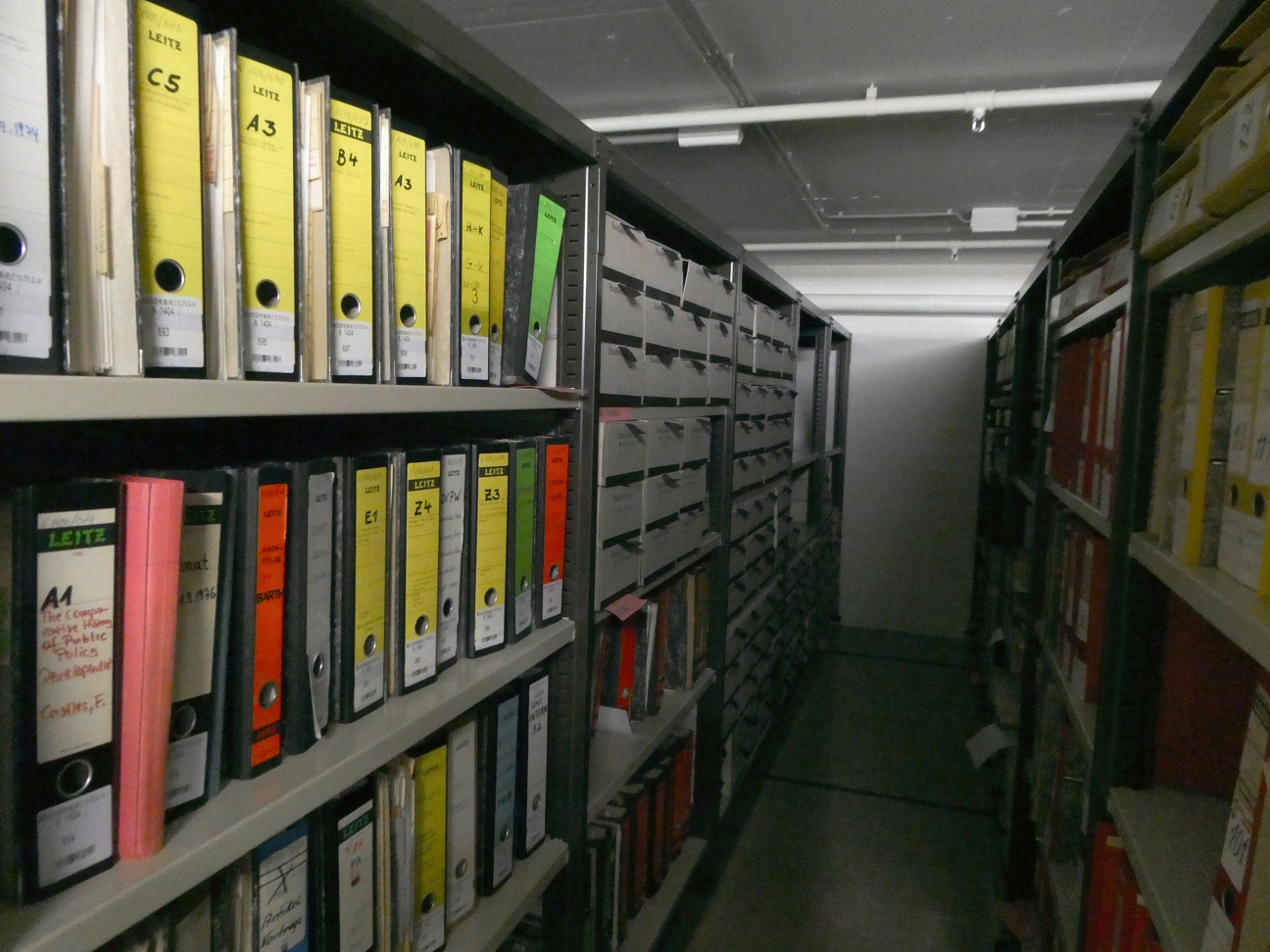 Drinnen im Archiv stehen dann dicht nebeneinander die Archivregale, so eng gereiht, dass begehbare Flure zwischen den Regalen nur durch ein Verschieben der Regale ermöglicht wird – sehr leichtgängig lässt sich das mit den Drehkreuzen am Kopf der Regale erledigen, obwohl in jedem der Regale fünf bis acht Tonnen Papier lagern. Die Regale, vor denen wir dann stehen, sind mit Namen beschriftet, von denen uns einige bekannt vorkommen – archiviert sind auch Nachlässe von bekannteren Persönlichkeiten, egal ob es sich dabei um Manuskripte, Notizen, Publikationen, Anweisungen oder um eher private Anmerkungen oder gar Liebesbriefe handelt. So soll es zum Beispiel sehr schöne Briefe des ersten Bundespräsidenten Theodor Heuss an seine Frau Elly geben.
