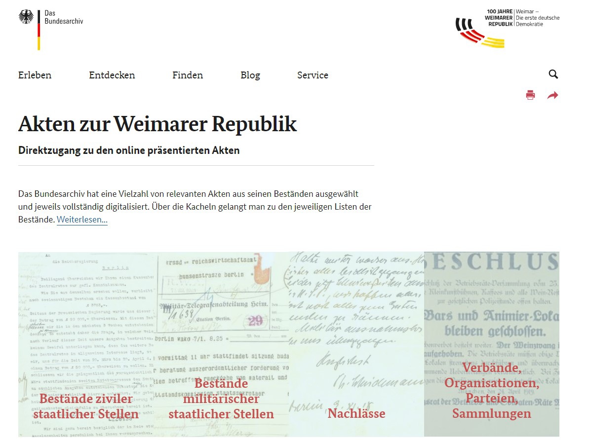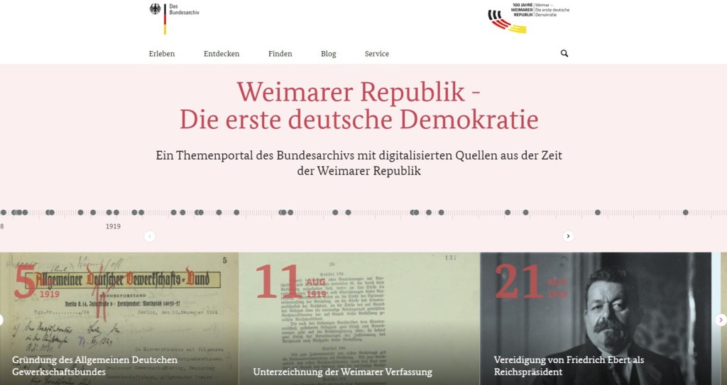 Einfach einmal beispielhaft die Zusammenstellung zur Weimarer Republik auf der Internetseite herausgepickt zeigt, was das Bundesarchiv alles bieten kann – nicht nur „trockene“ Dokumente, sondern auch Fotos, Filme und Plakate, die in dem Zeitraum, der im Archiv dokumentiert ist, entstanden sind.