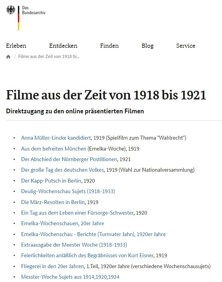 Der Bereich „entdecken“ liefert weitere Themen; wer eher nach bestimmten Medien sucht, kann gezielt in diese Richtung starten – Akten, Filme, Karten, Fotos und mehr, alles wirklich gut zugänglich gemacht. Gerade die alten Filme sind nicht nur interessante Zeitzeugnisse, sondern einfach auch unterhaltsame Berichte über Politik, Gesellschaft und auch das alltägliche leben. Auch wer einfach Spaß und Freude an alten Filmen hat: Auf diesen Seiten sind sie zu finden.