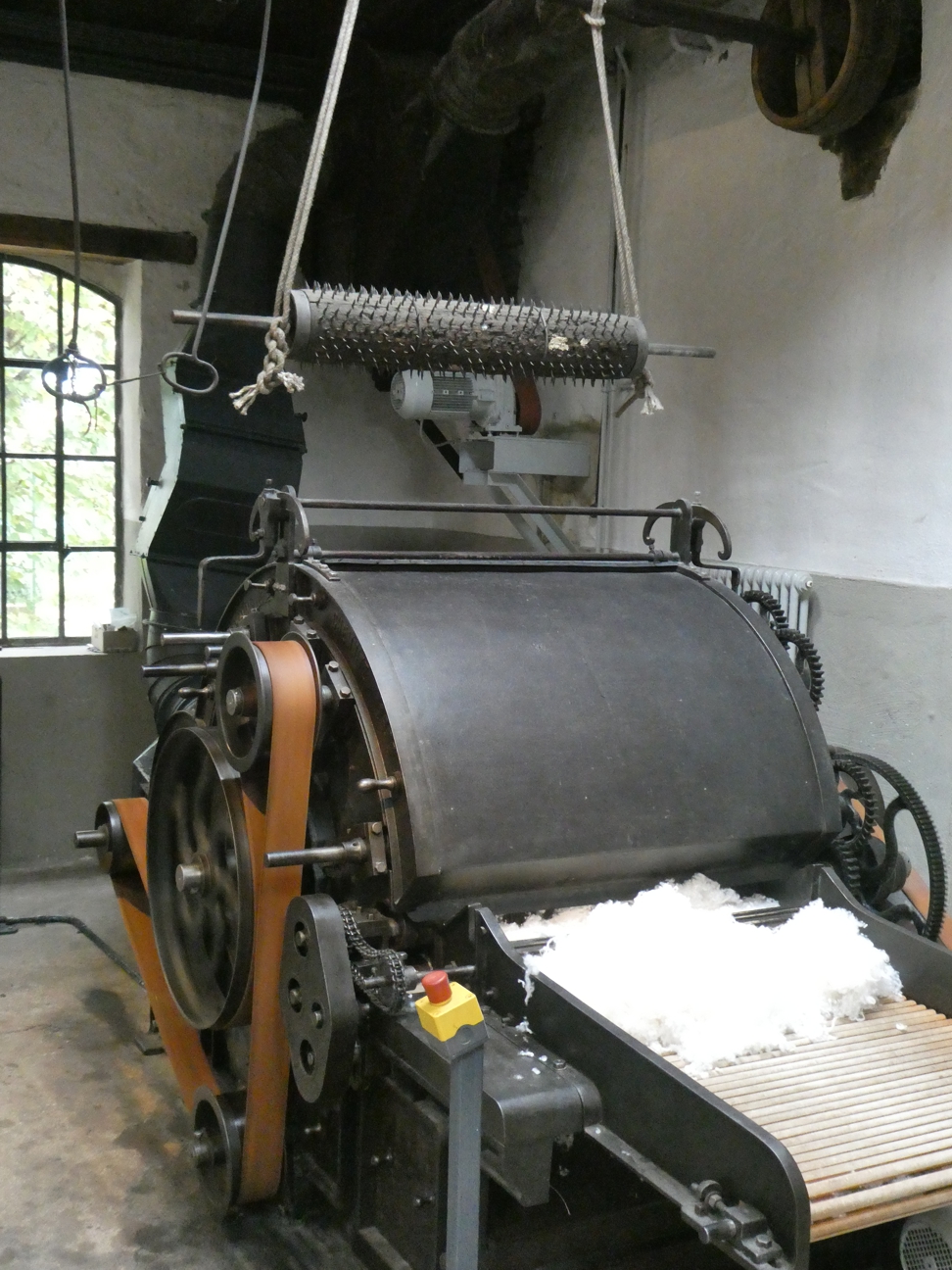 Gleich zum Start geht es in einen großen Raum, der Wolferei. Links steht eine Maschine, gespickt mit Stacheln unterschiedlicher Größe, angetrieben über lederne Transmissionsriemen – der Krempelwolf. Hinten im Raum stehen große prall gefüllte Säcke – an einem der offenen sehen wir, dass diese voller grober, ziemlich ineinander zerknuddelter, fast schon etwas verfilzter, jedoch gereinigter Wolle sind. Anscheinend gibt es unterschiedliche Qualitäten, auch verschiedene Wollfarben. In der Wolferei wird die Wolle für die gewünschte Stoffqualität zusammengestellt, vermengt, und vom Krempelwolf fein zerrupft und so vorbereitet für die weitere Verarbeitung zum Garn. Die Maschine wird für uns angeworfen. Die Lederkeilriemen setzen die Antriebsräder in Bewegung. Ein Arbeiter wirft das Wollgemenge auf ein Band – die Maschine zieht ein, rattert und rupft die Wolle. Weiter hinten im Raum schneit es dünne Wollflocken in einen Sammelsack hinein – die kommen über ein Gebläse, das alles, was klein genug gerupft ist, aus der Maschine pustet.